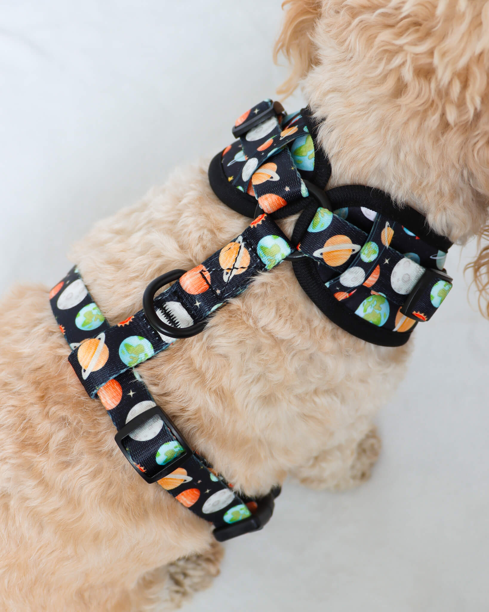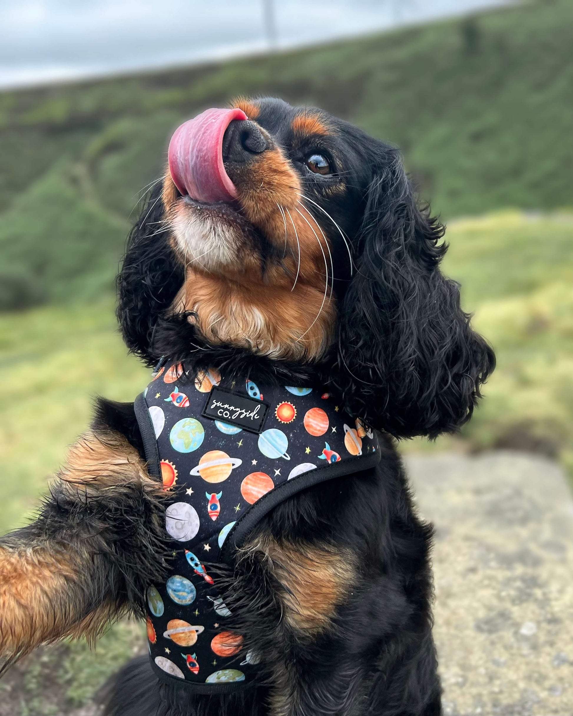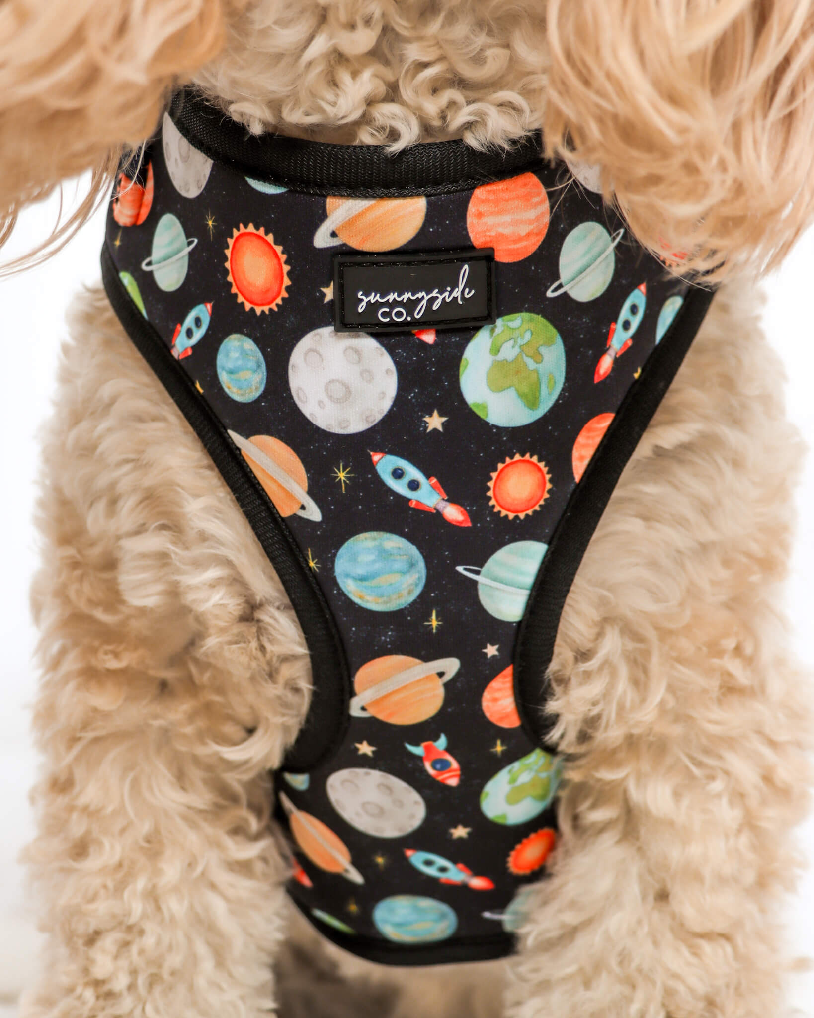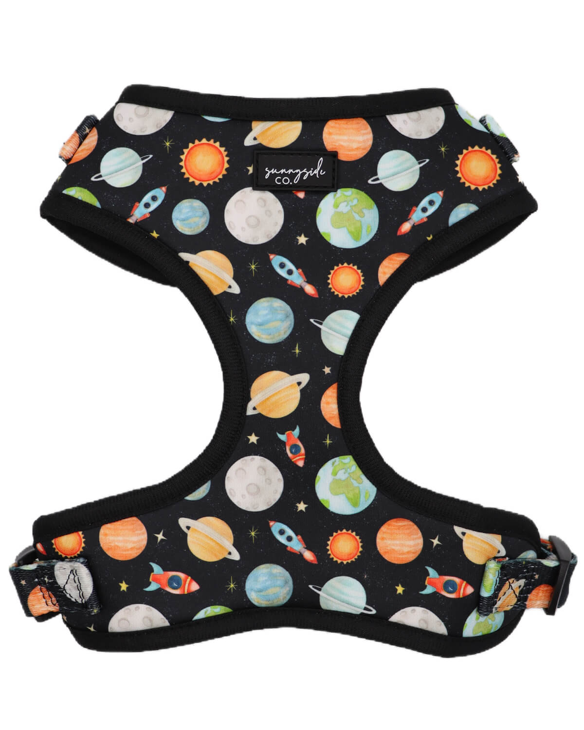 Against a black starry background, the watercolour planets and rockets really POP in our 'Beyond the Stars' adjustable harness! An elegant but lively design perfect for your little spaceman (or space girl!)