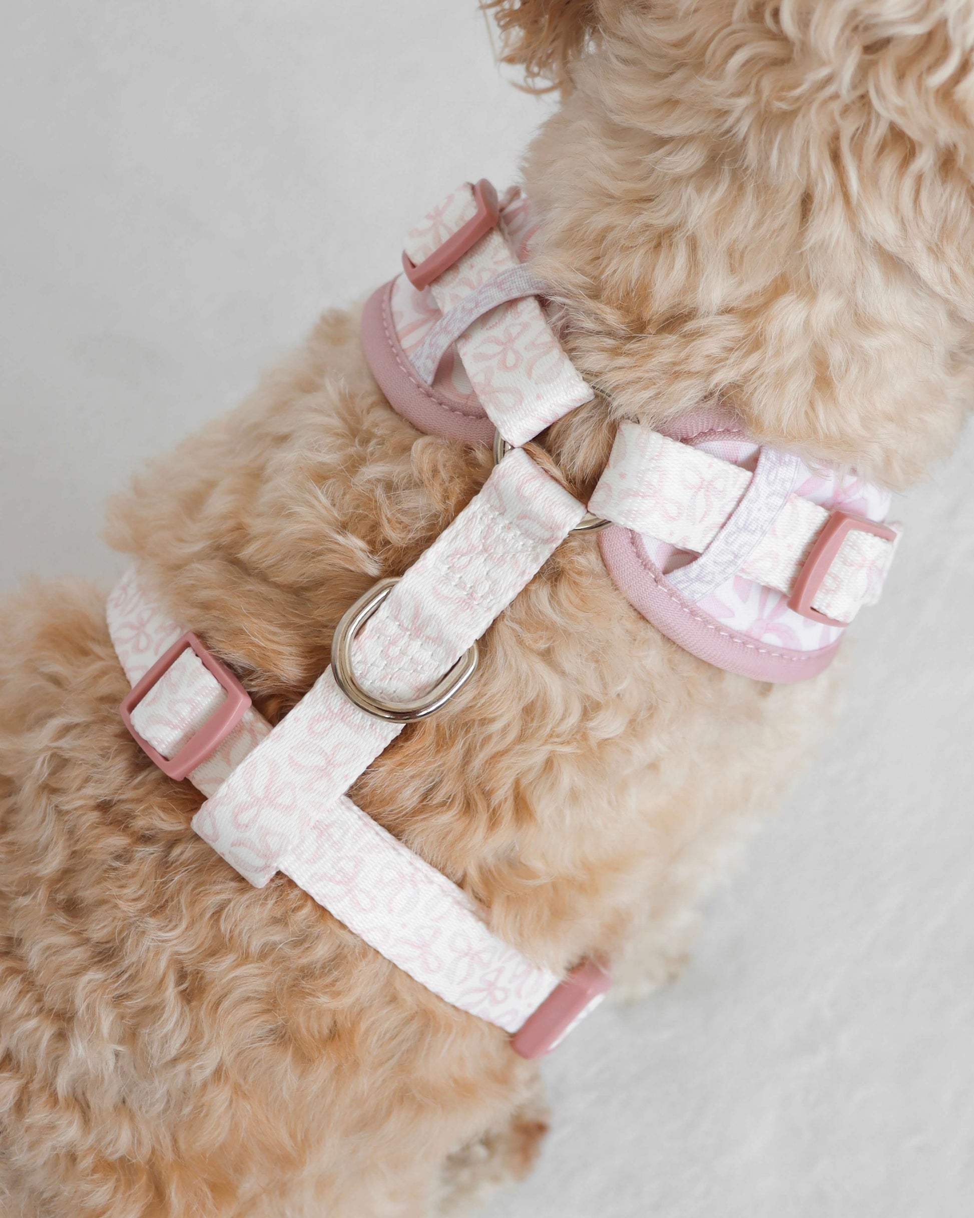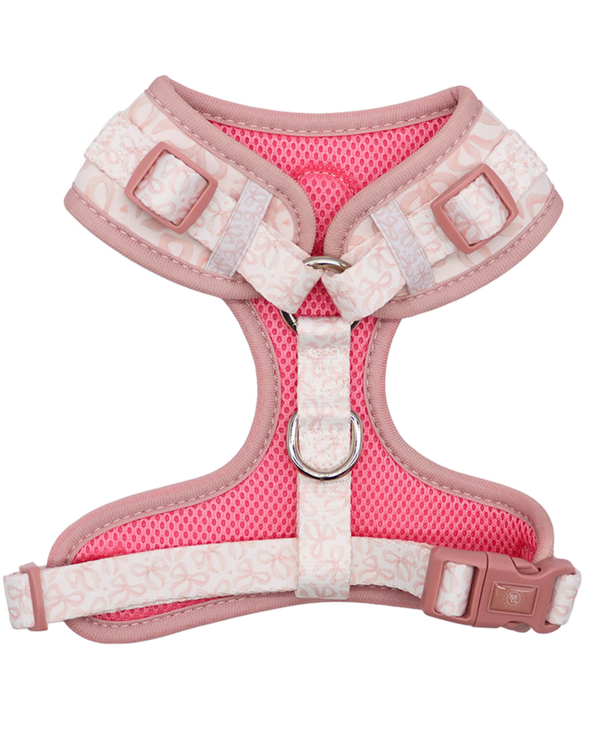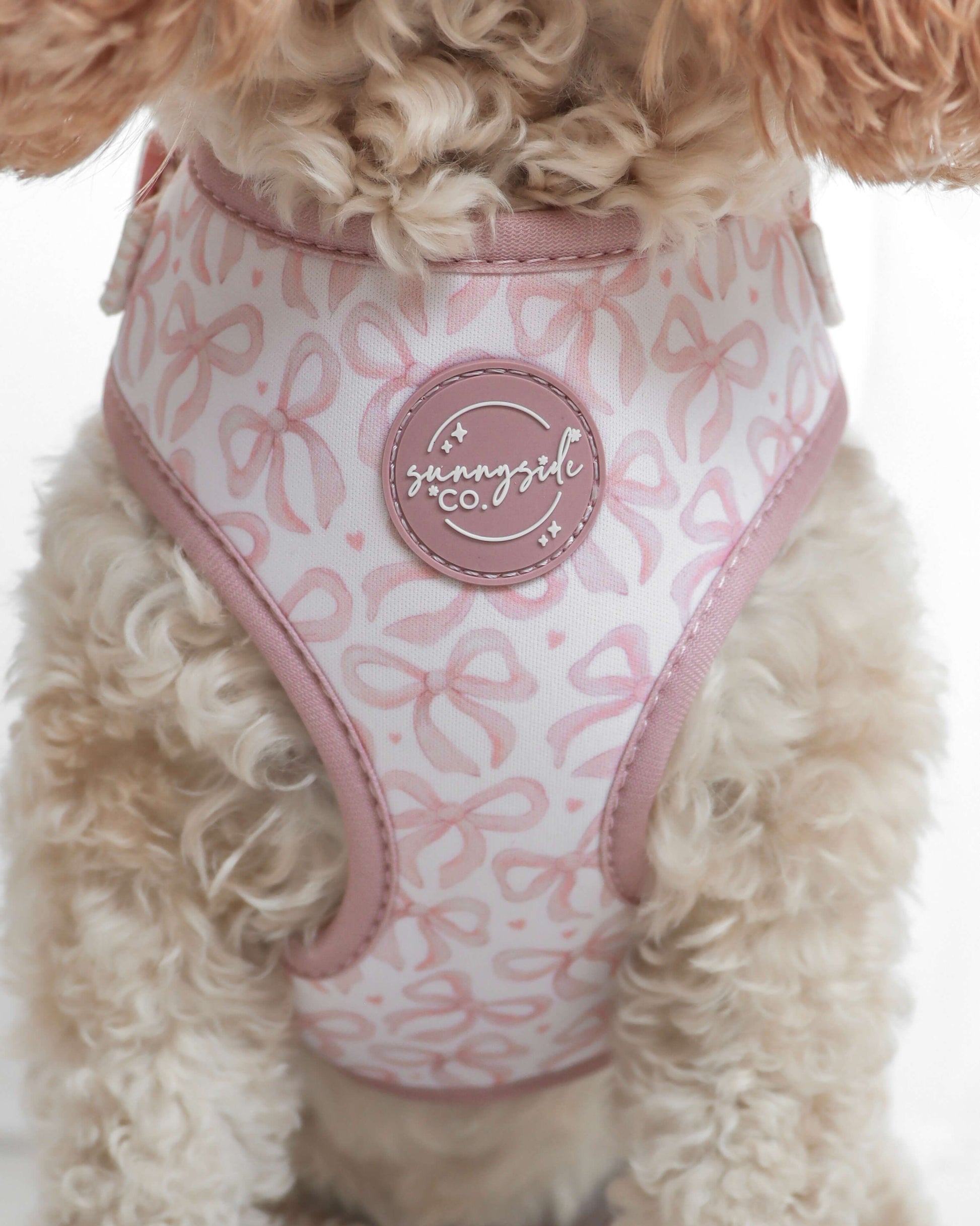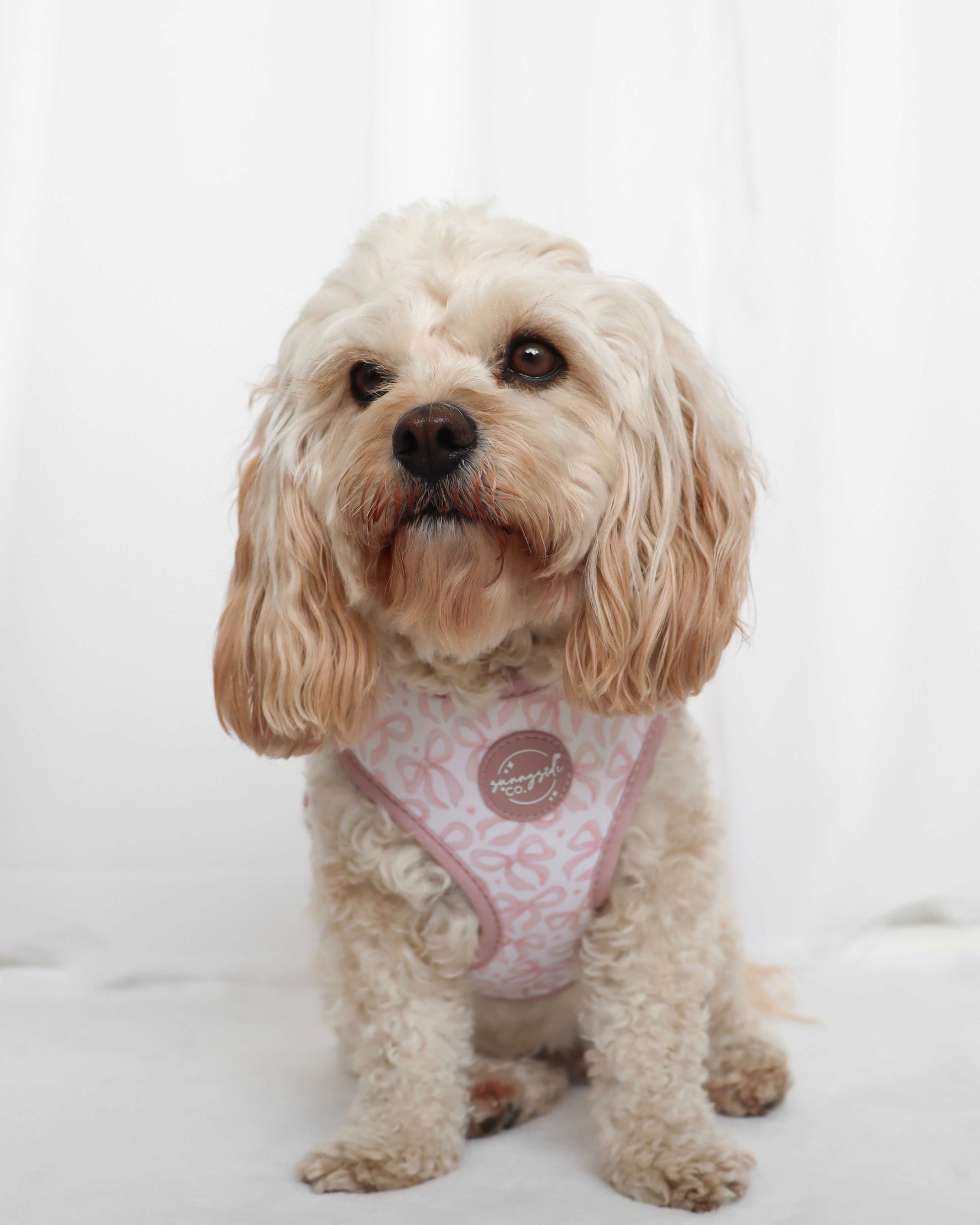 The 'Bow So Cute' adjustable harness features hand-drawn watercolour bows in the sweetest dusky pink shades. This design is perfect for the girly girls!