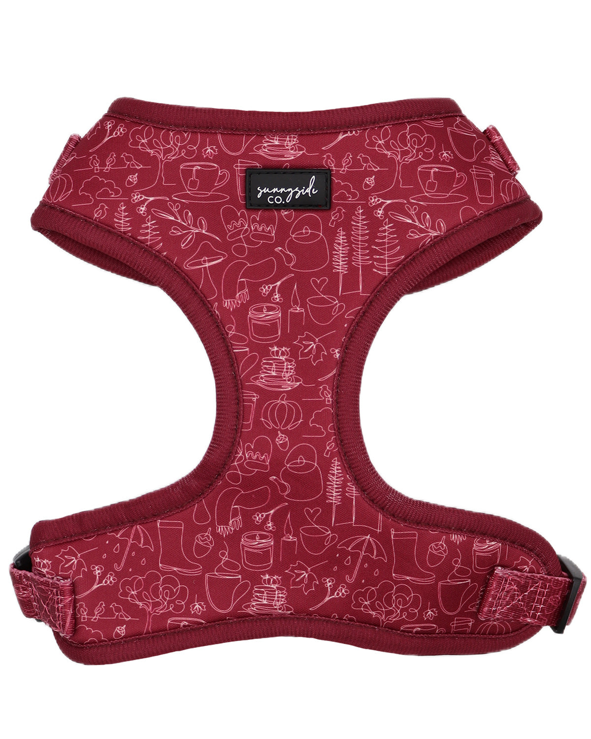The 'Burgundy Doodles' adjustable harness is a beautiful deep shade of burgundy. (& is a slightly different shade to our best seller; Burgundy Love!) It features fine line art of your favourite Autumnal essentials. Candles, cups of tea, pumpkins & more! This unisex design is perfect for boys or girls.