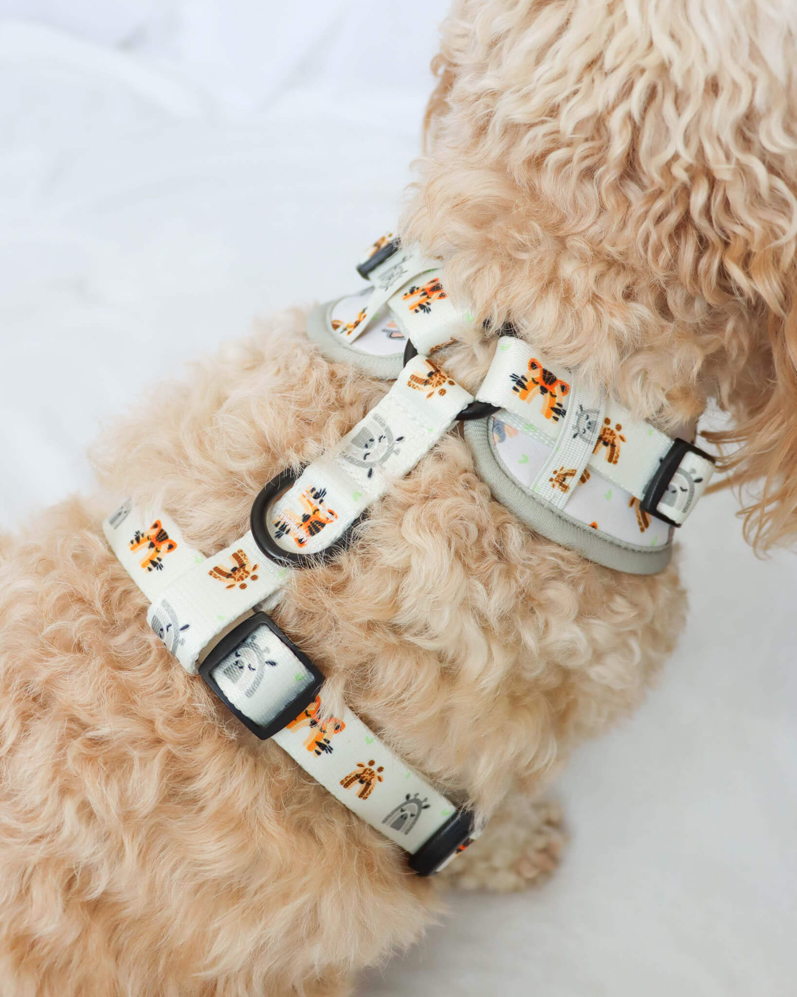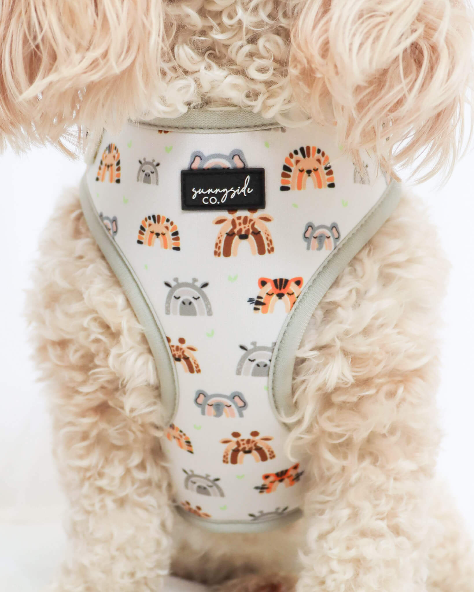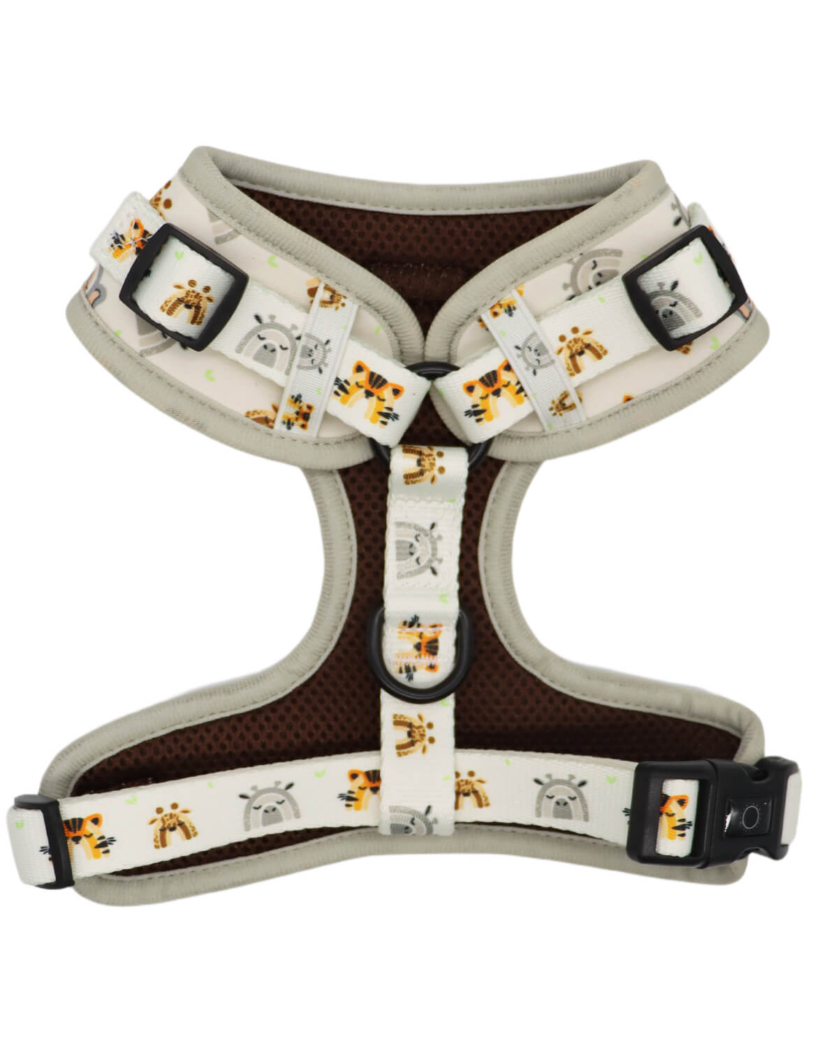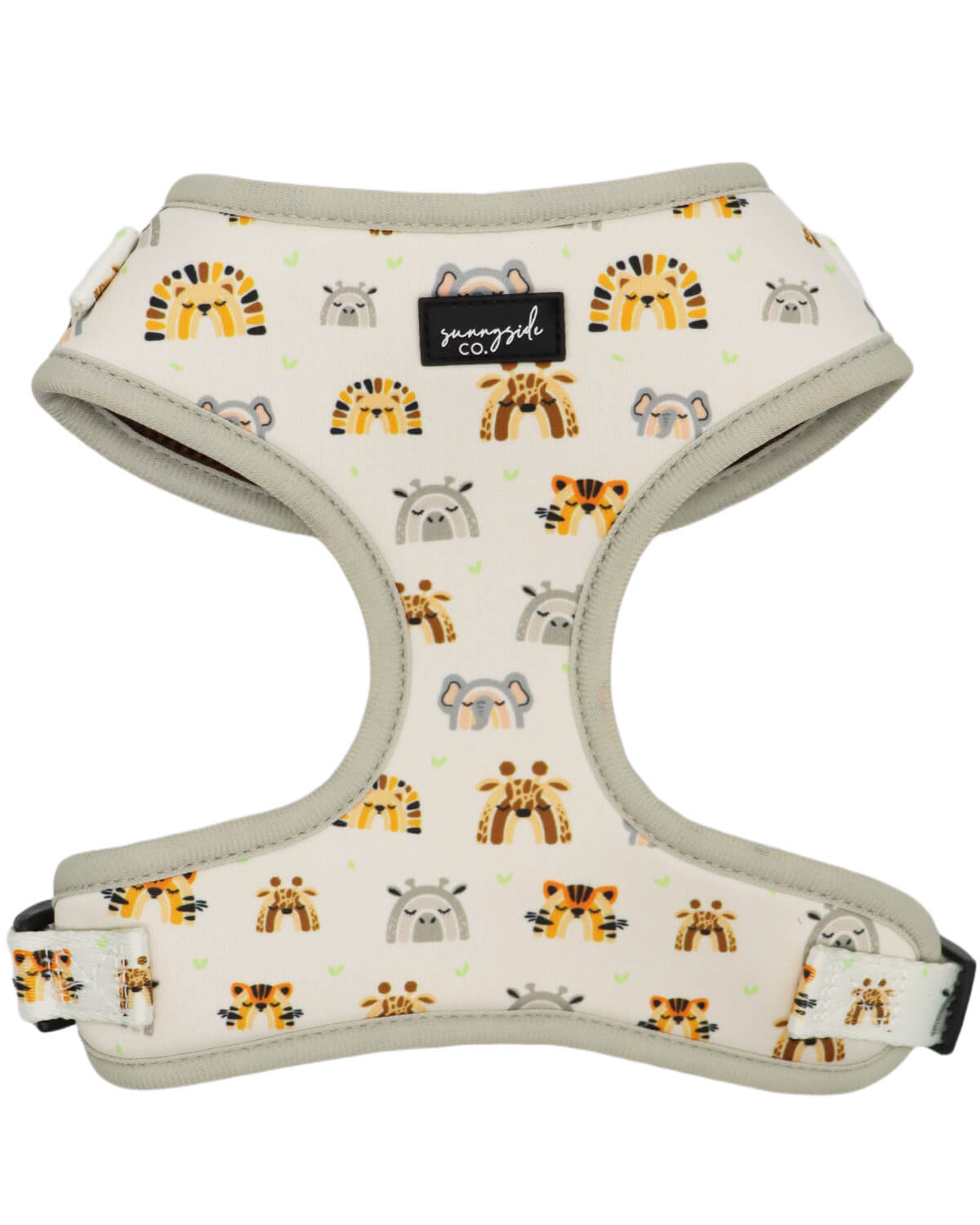 The 'Rainforest Rainbows' adjustable harness features beautiful boho-style jungle animals, designed in the shape of adorable rainbows.