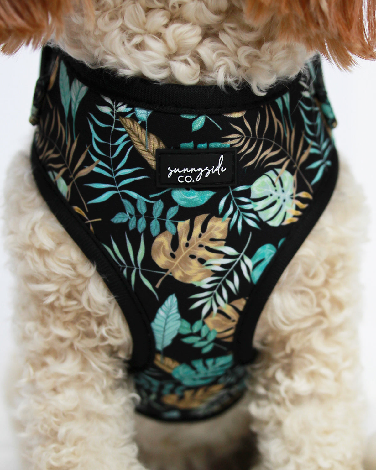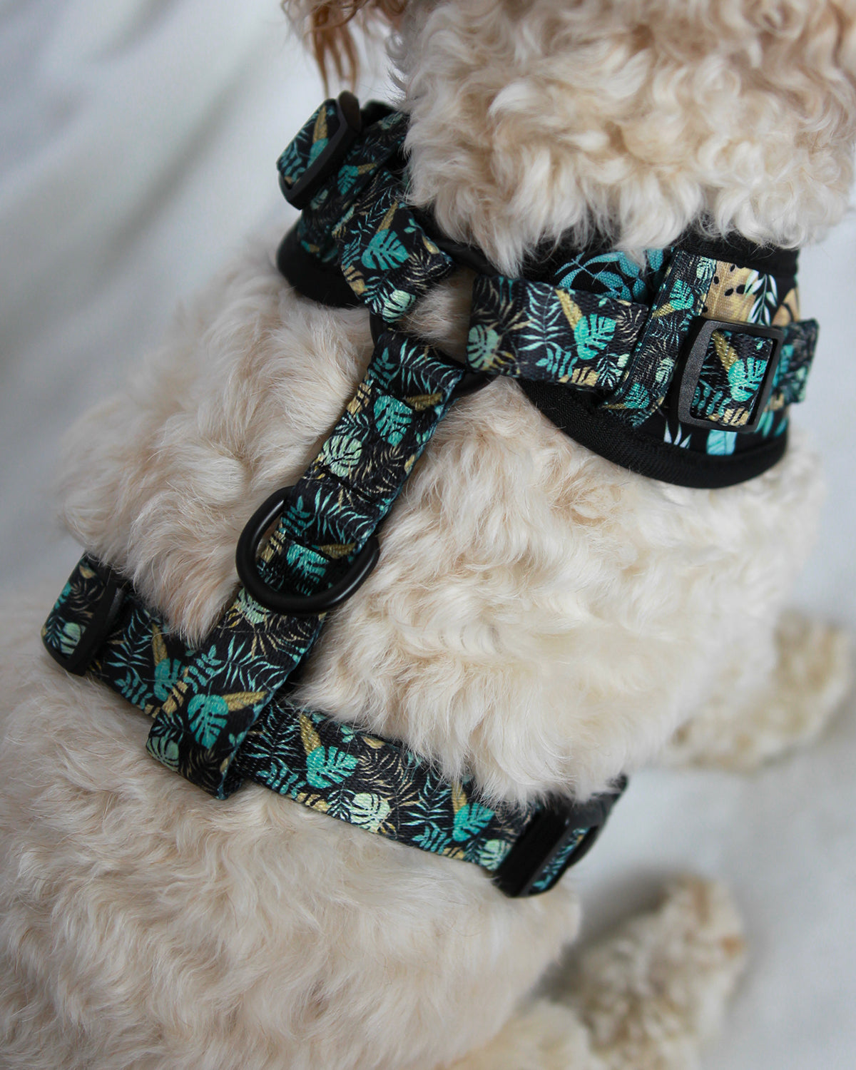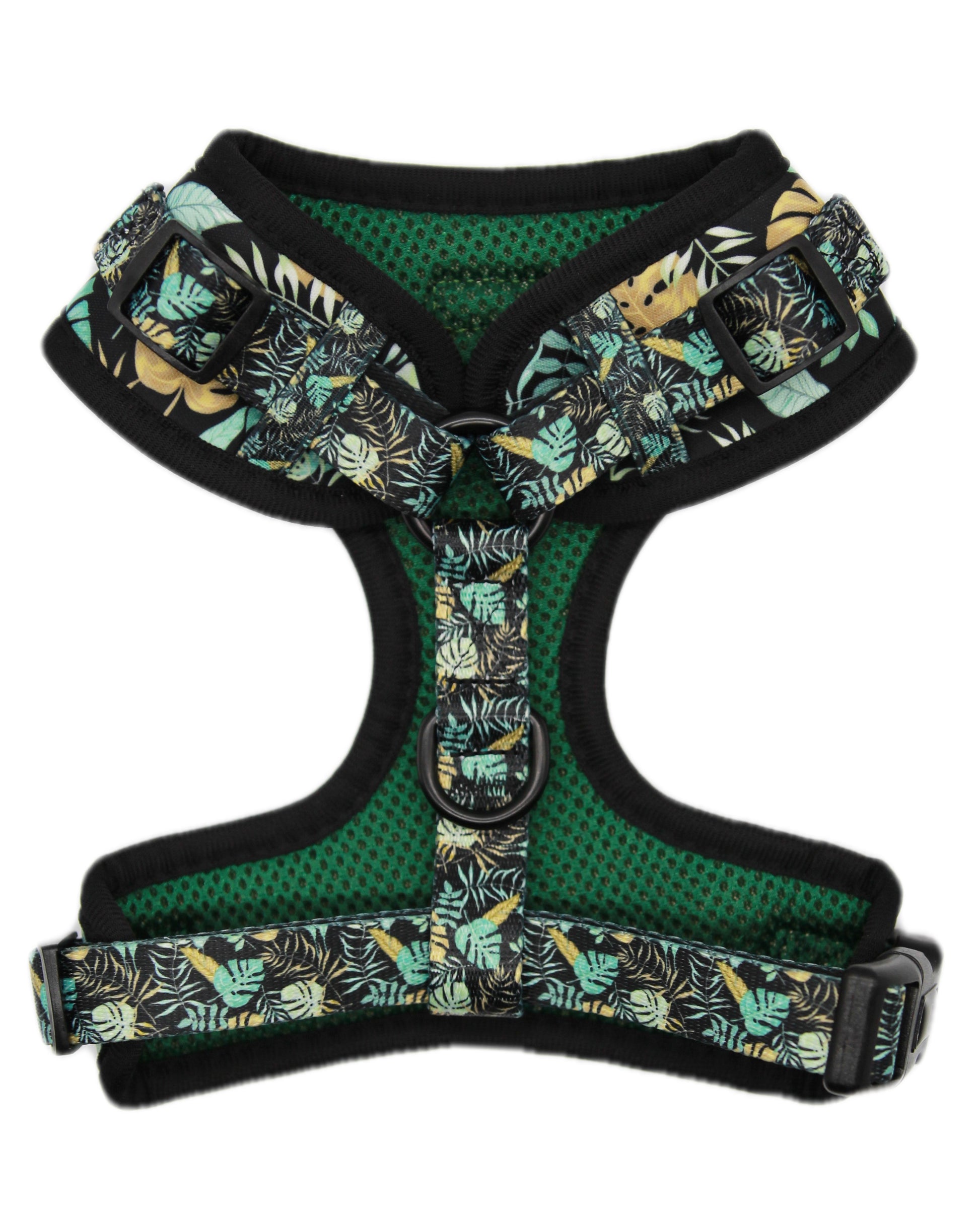 The 'Golden Palm' adjustable harness features a black background with a variety of green and gold leaves. It’s classy but practical!