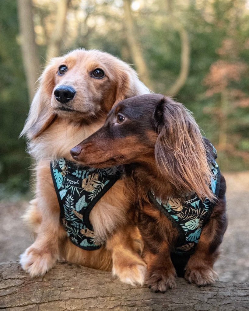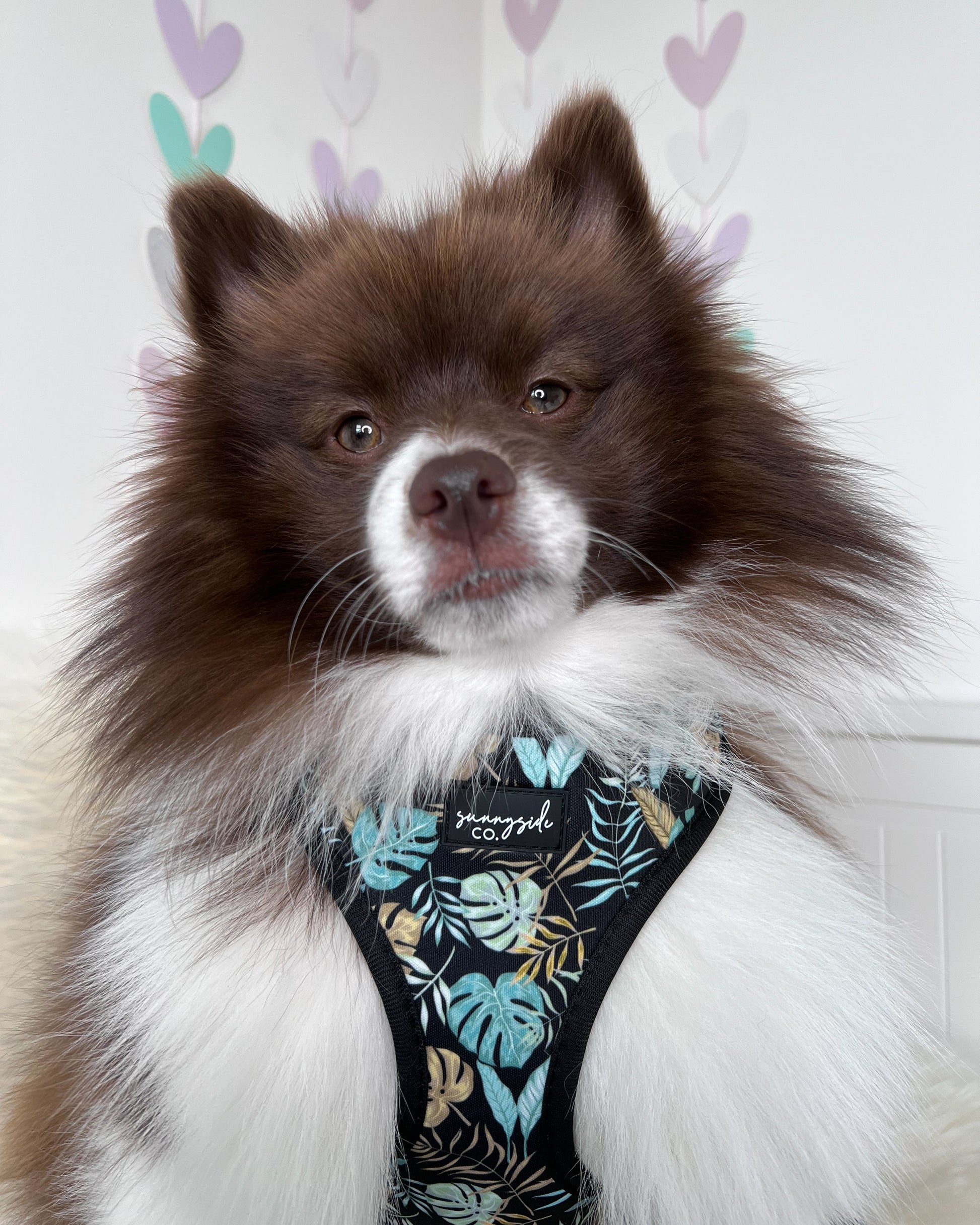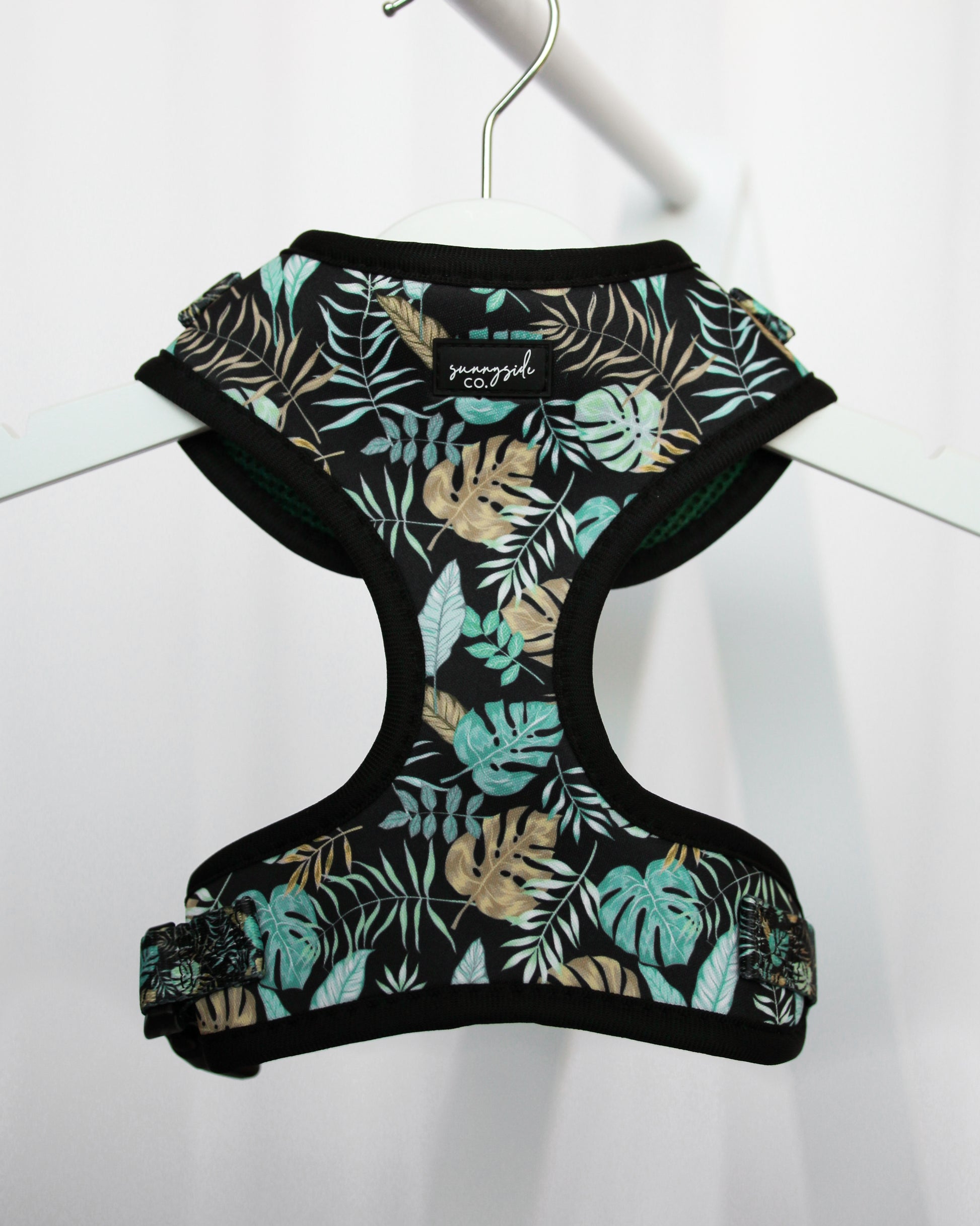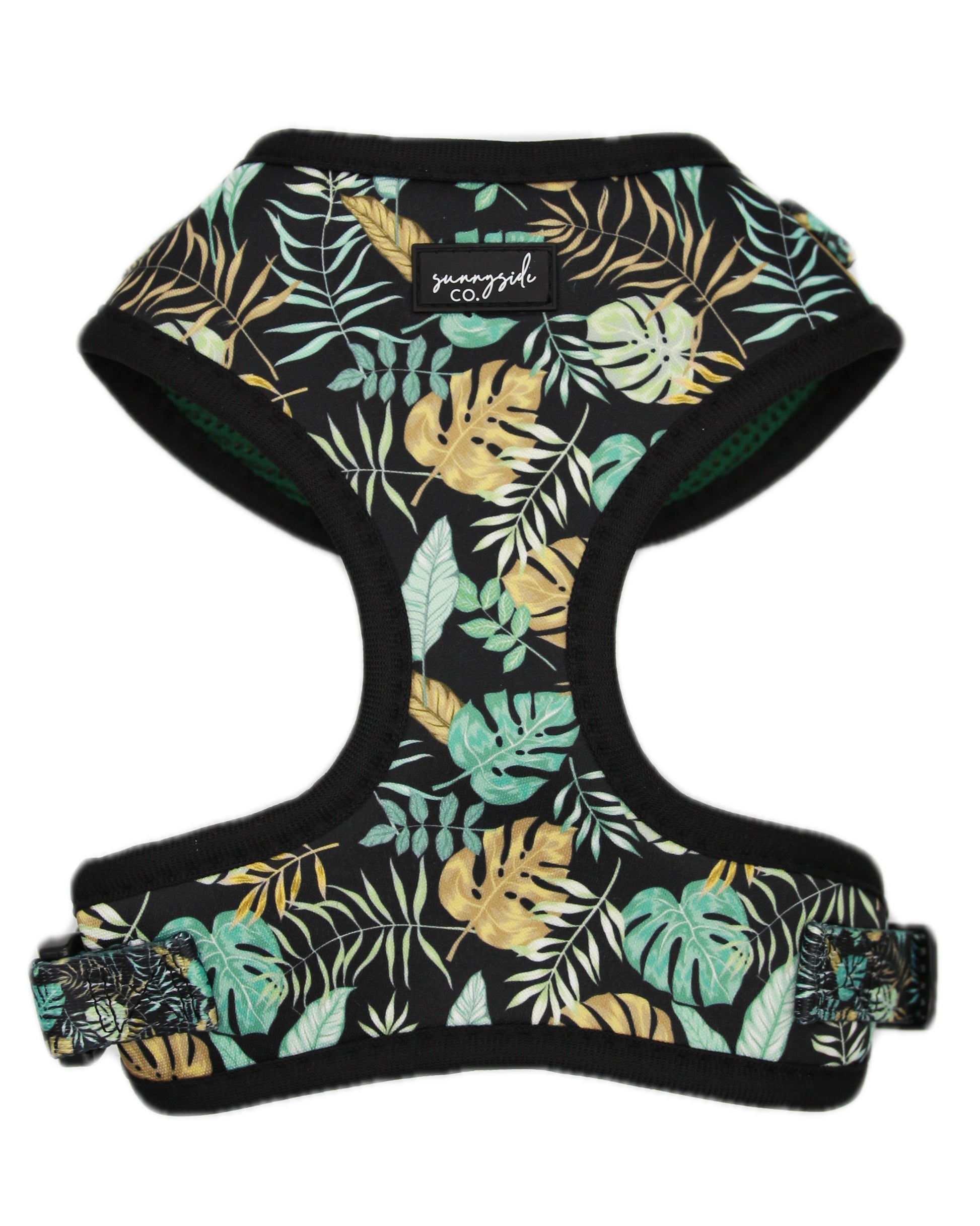 The 'Golden Palm' adjustable harness features a black background with a variety of green and gold leaves. It’s classy but practical!
