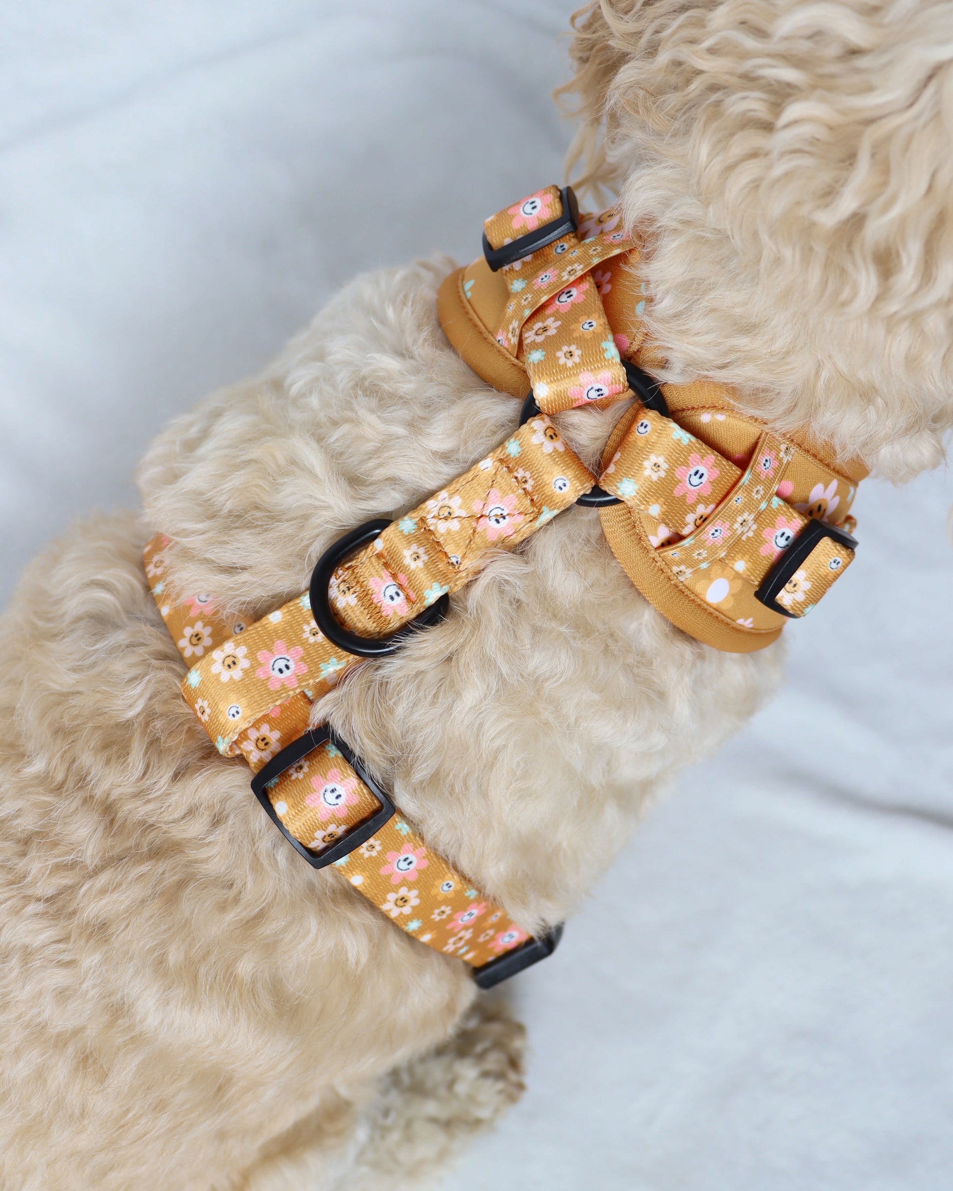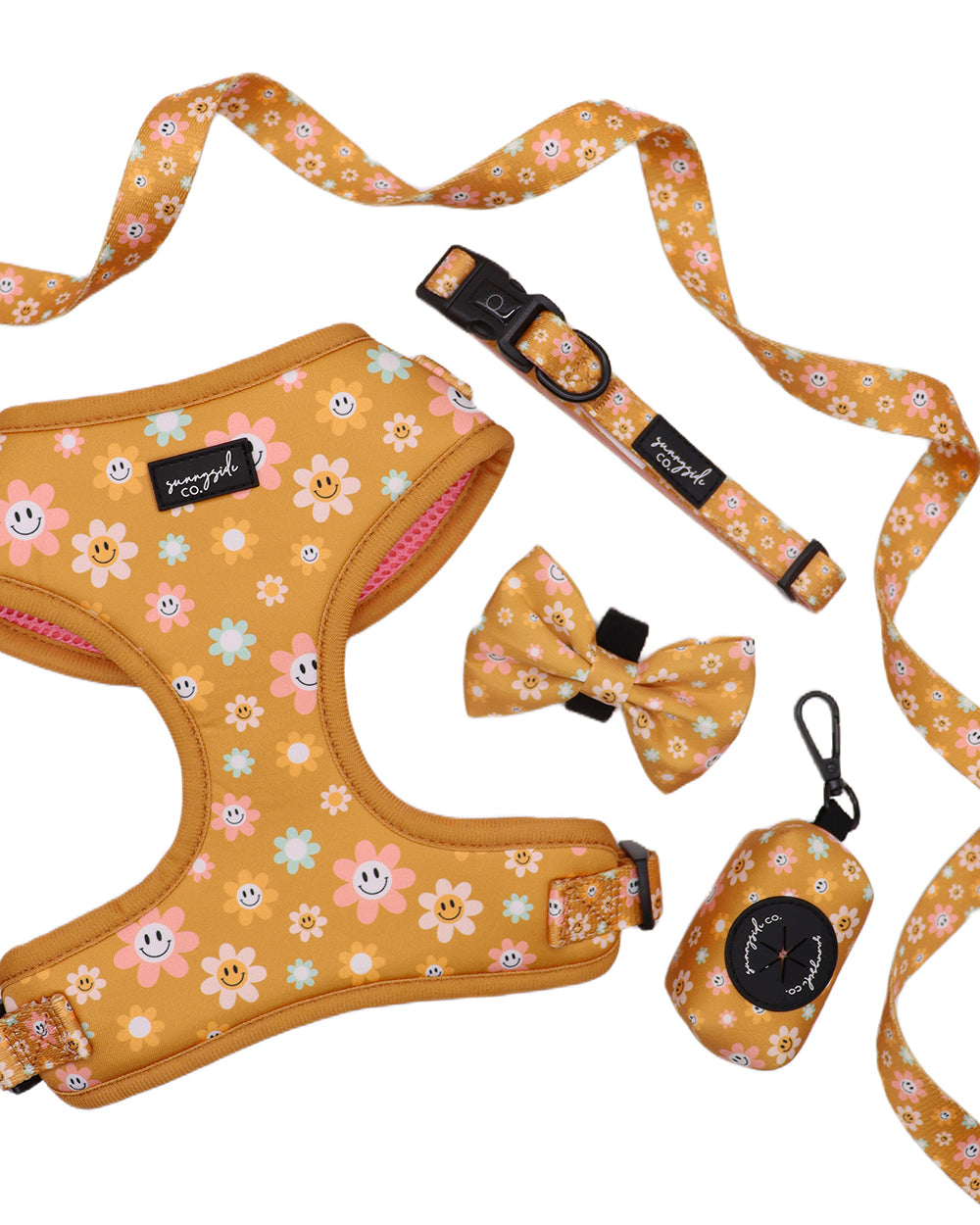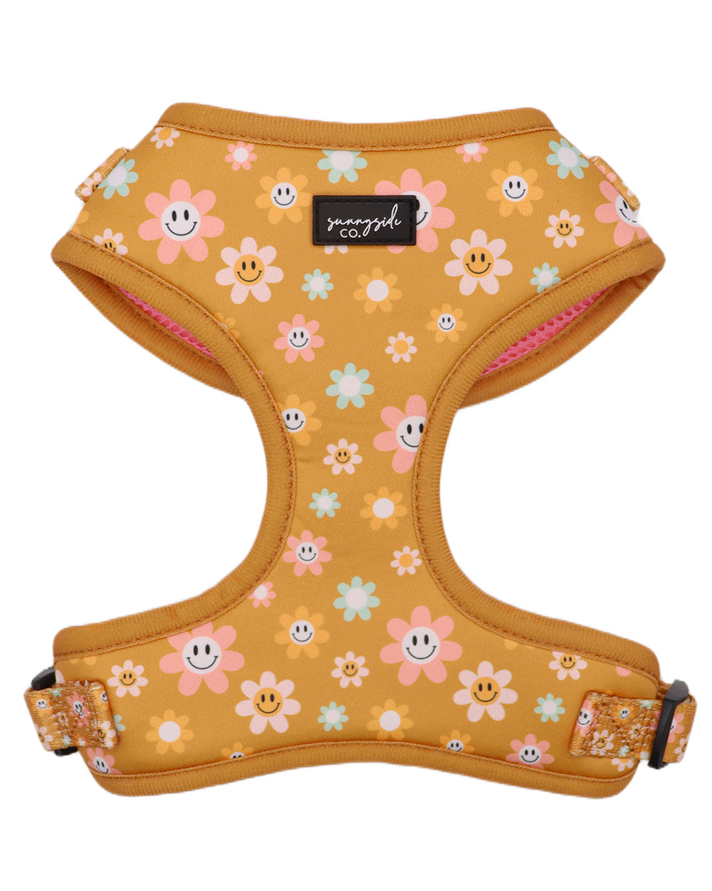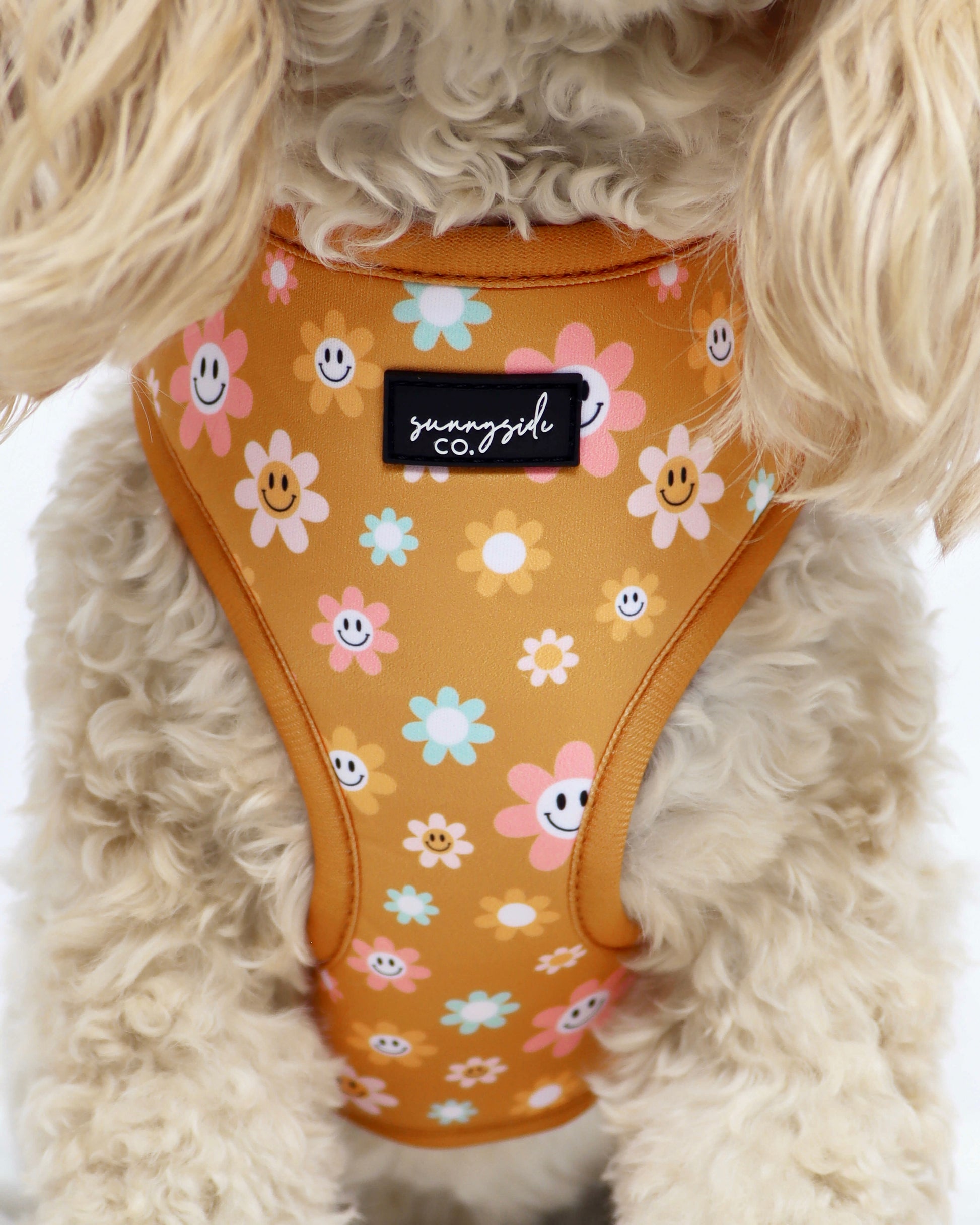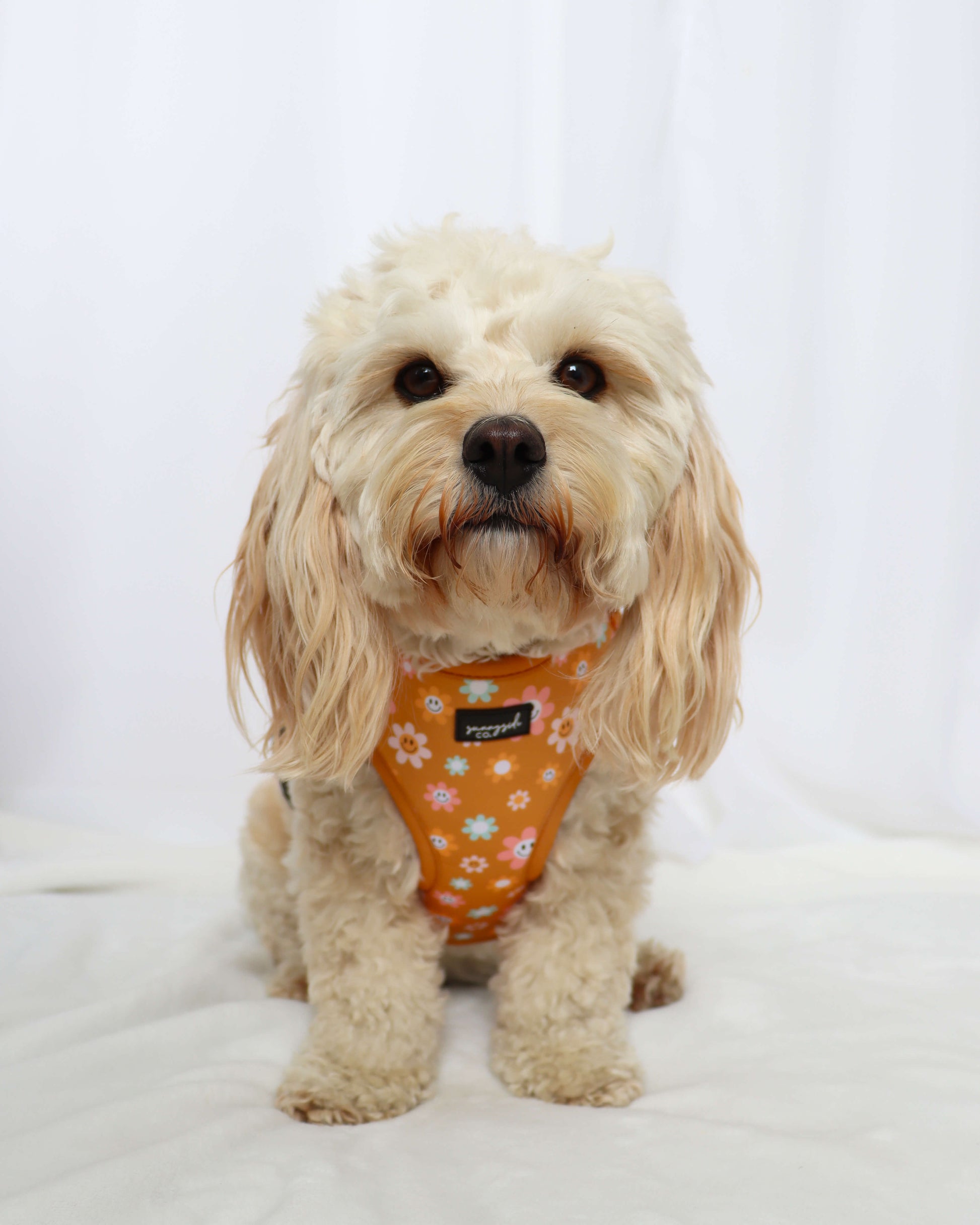 The 'Groovy Pup' adjustable harness features pink, peach & mint smiley flowers, standing out against the rich orange background. Colourful but classy! The perfect design for your pup to wear all year round.