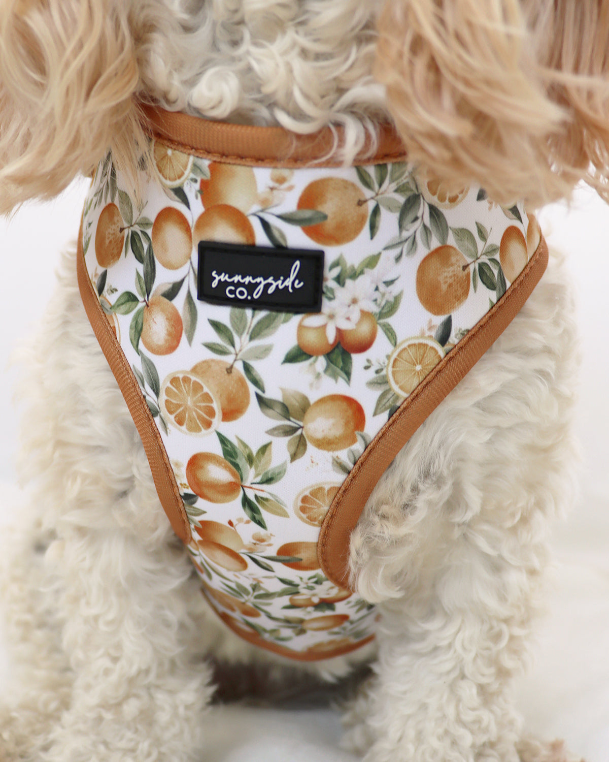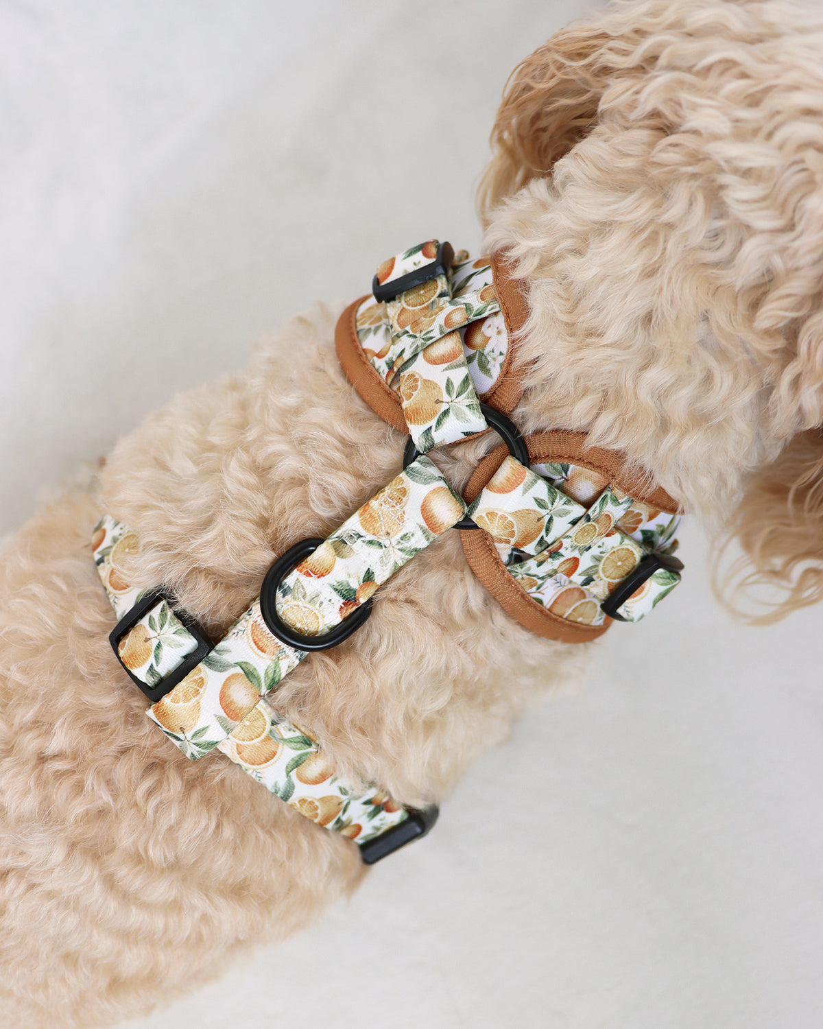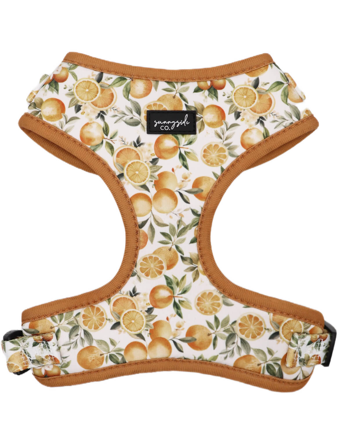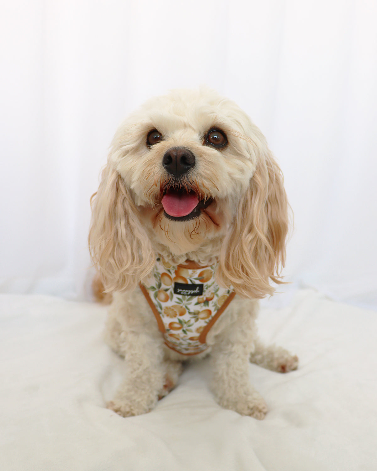 The 'Orange Blossom' adjustable harness features watercolour oranges, with sage green leaves and a hint of blossom. The burnt orange edge really makes the design POP. This unisex design suits so many fur colours and breeds too! Usually when you think of fruity products, bright colours come to mind, right? But the new 'Subtly Sweet' collection is filled with muted, subtle and understated tones. We've turned down the saturation, and turned up the timeless vibes!
