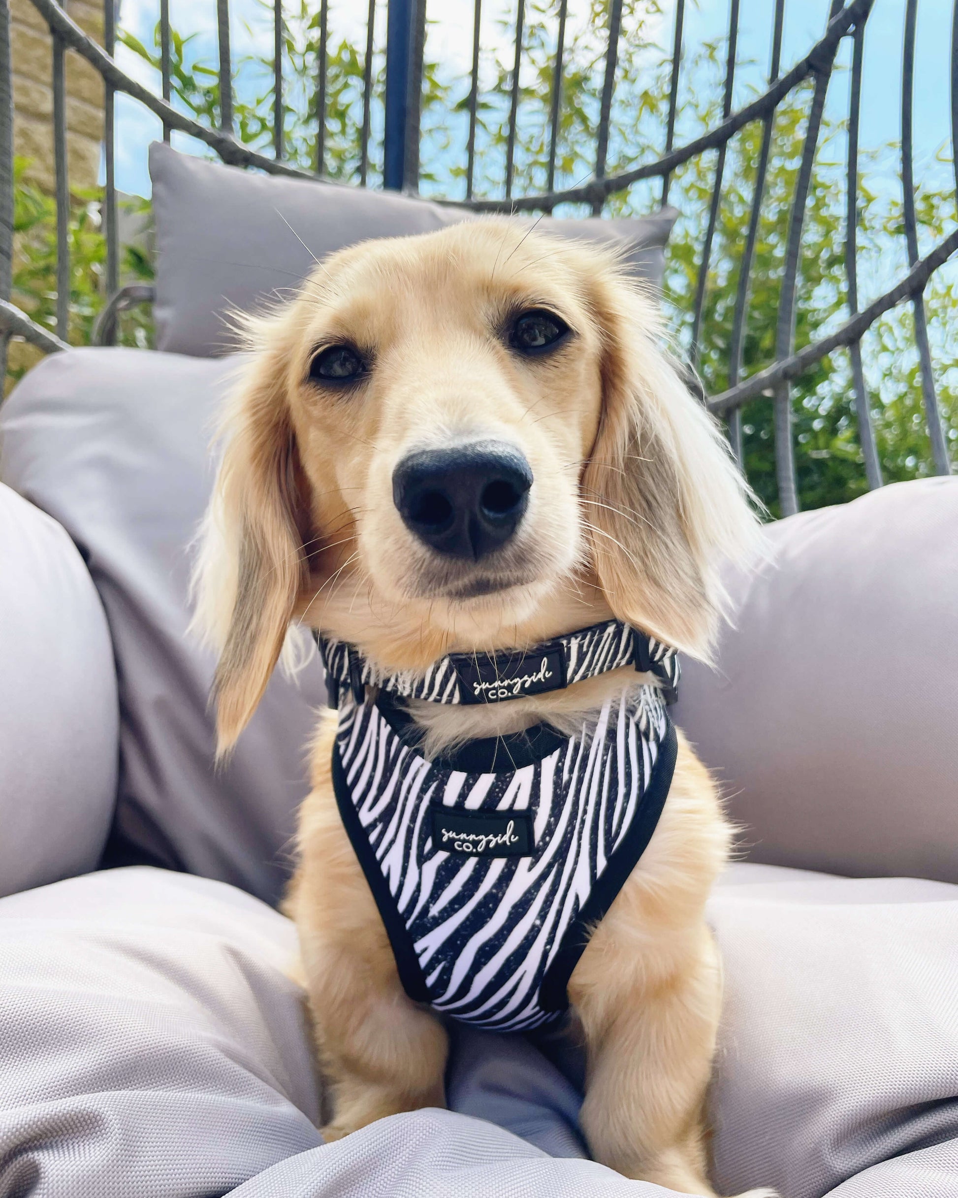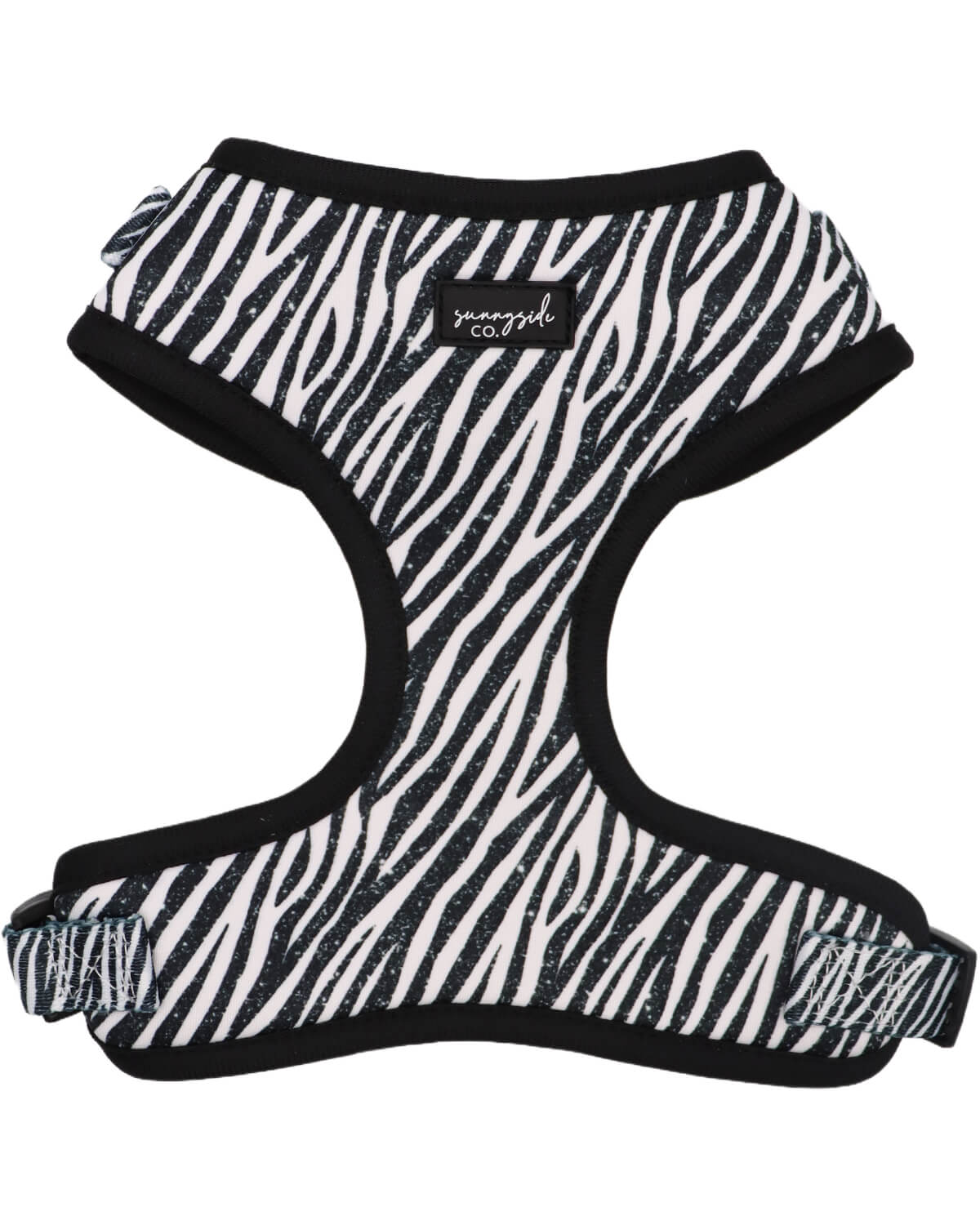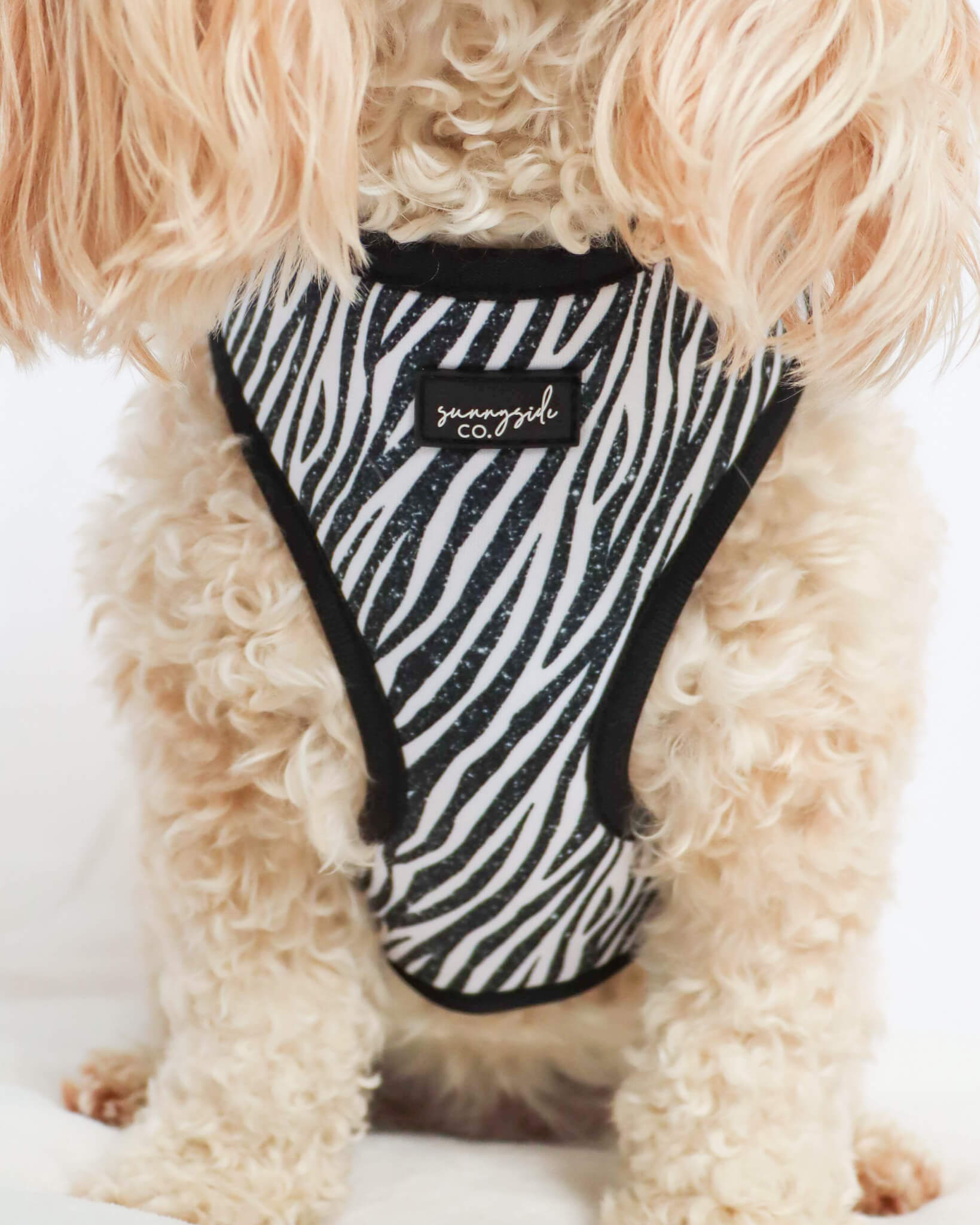 The 'Party Animal' adjustable harness is perfect for a diva, male or female! It features a striking zebra print pattern, finished with black edging for an extra bold vibe. The contrasting stripes of the design feature a black sparkle effect, making this unisex harness perfect for the park or a party, while still being easy to wash!