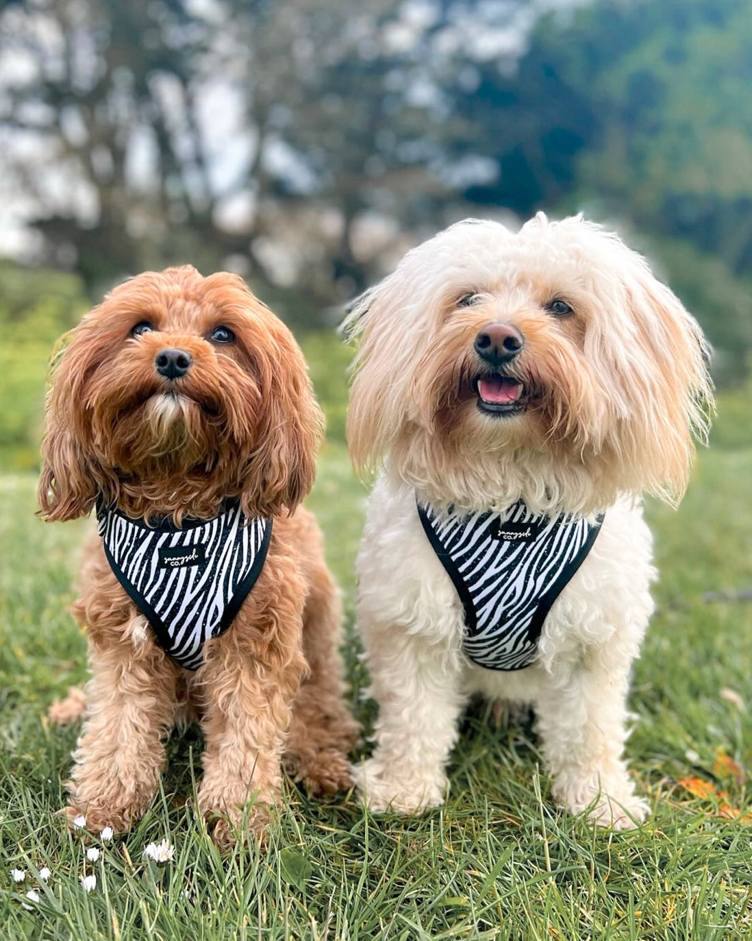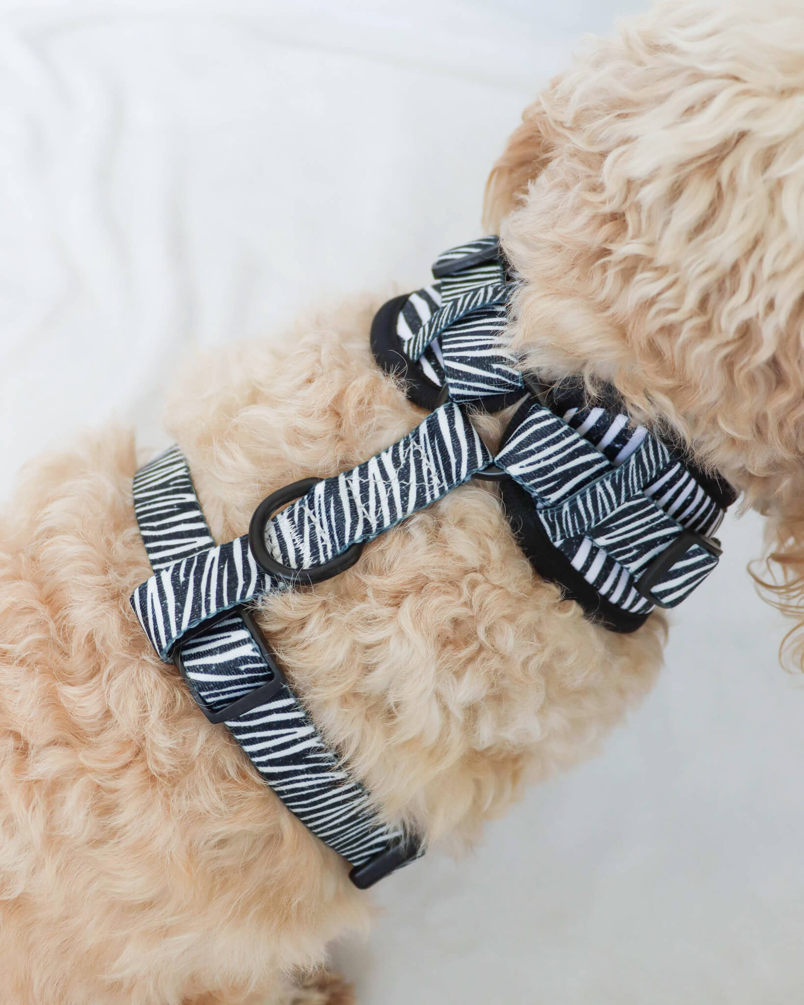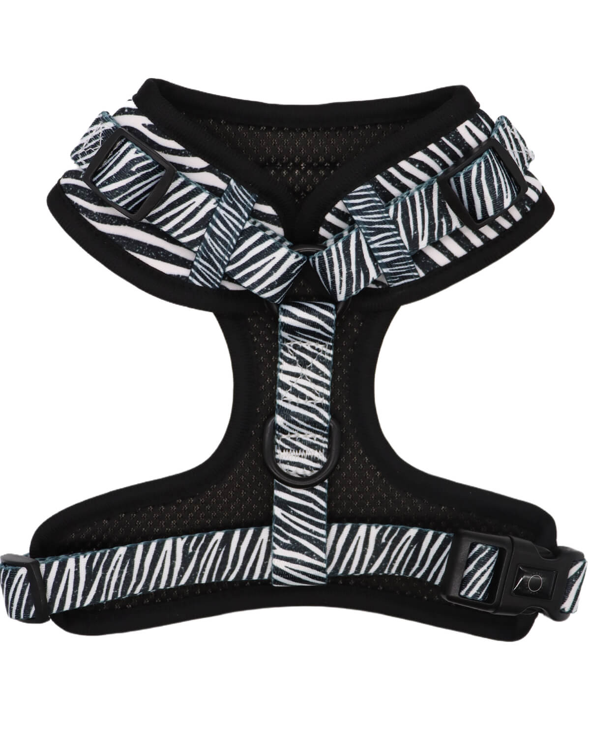 The 'Party Animal' adjustable harness is perfect for a diva, male or female! It features a striking zebra print pattern, finished with black edging for an extra bold vibe. The contrasting stripes of the design feature a black sparkle effect, making this unisex harness perfect for the park or a party, while still being easy to wash!