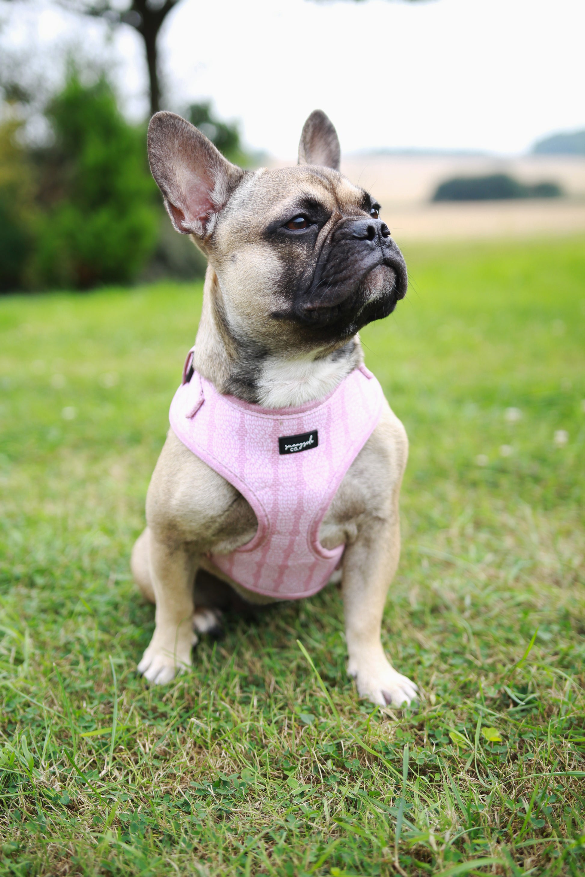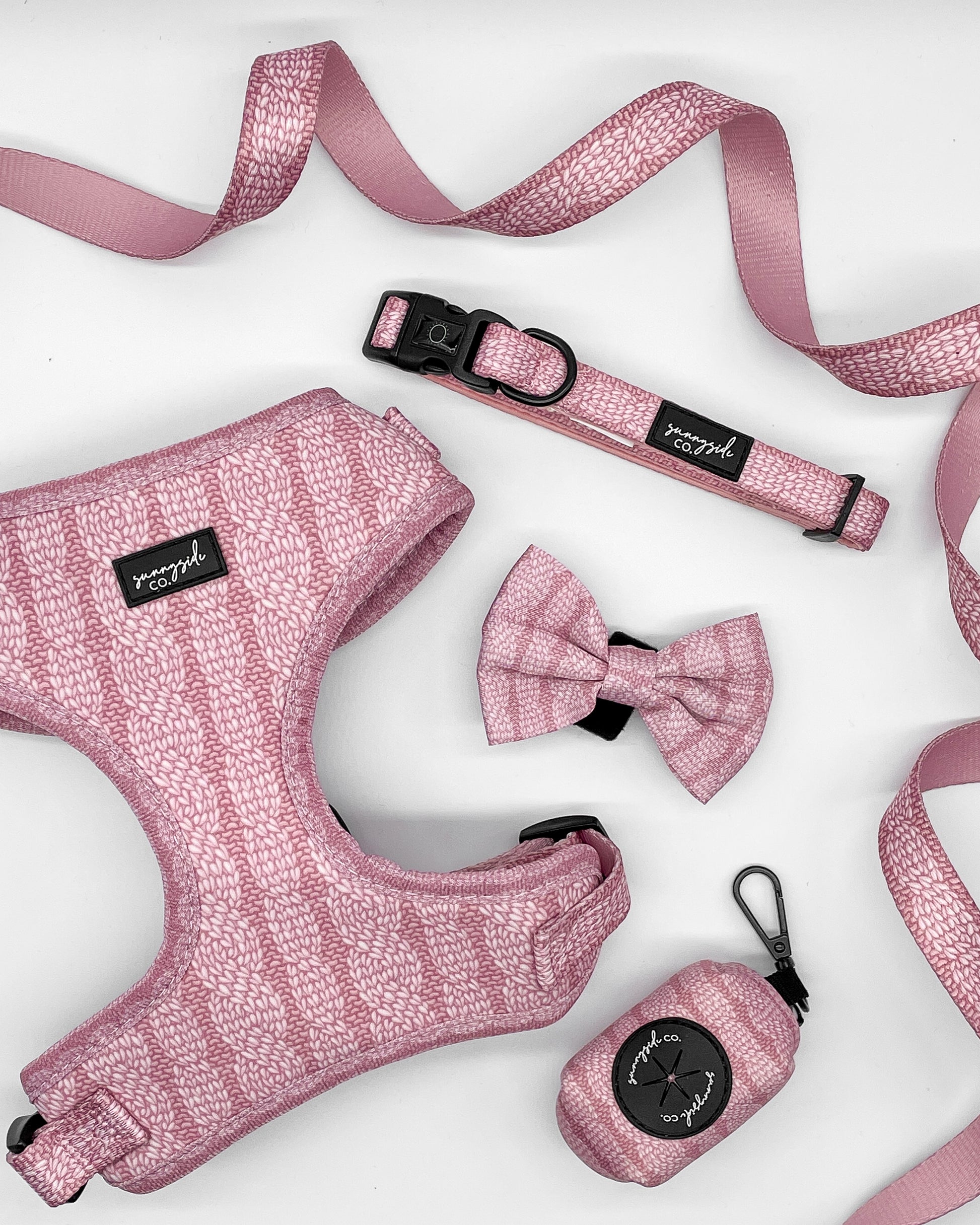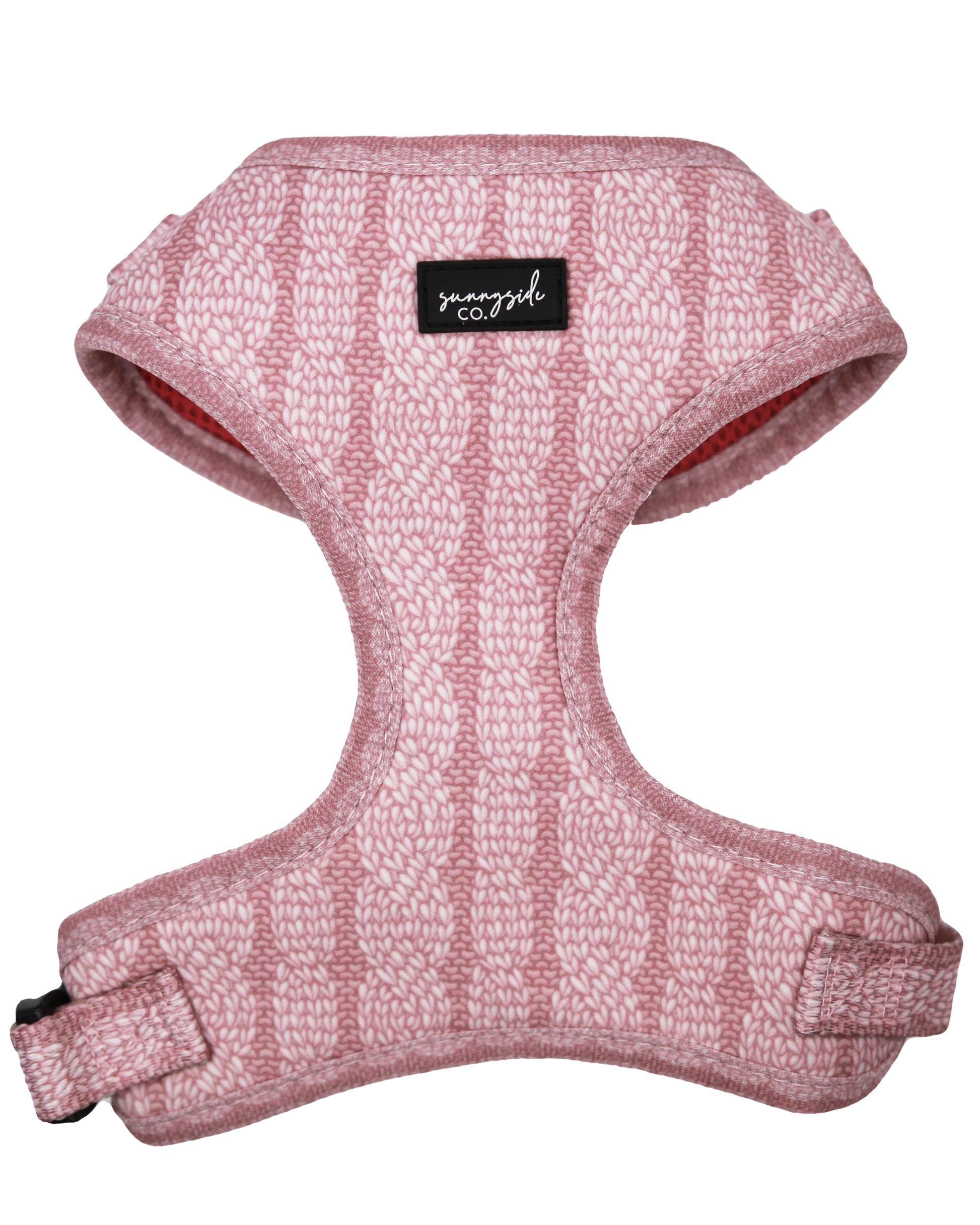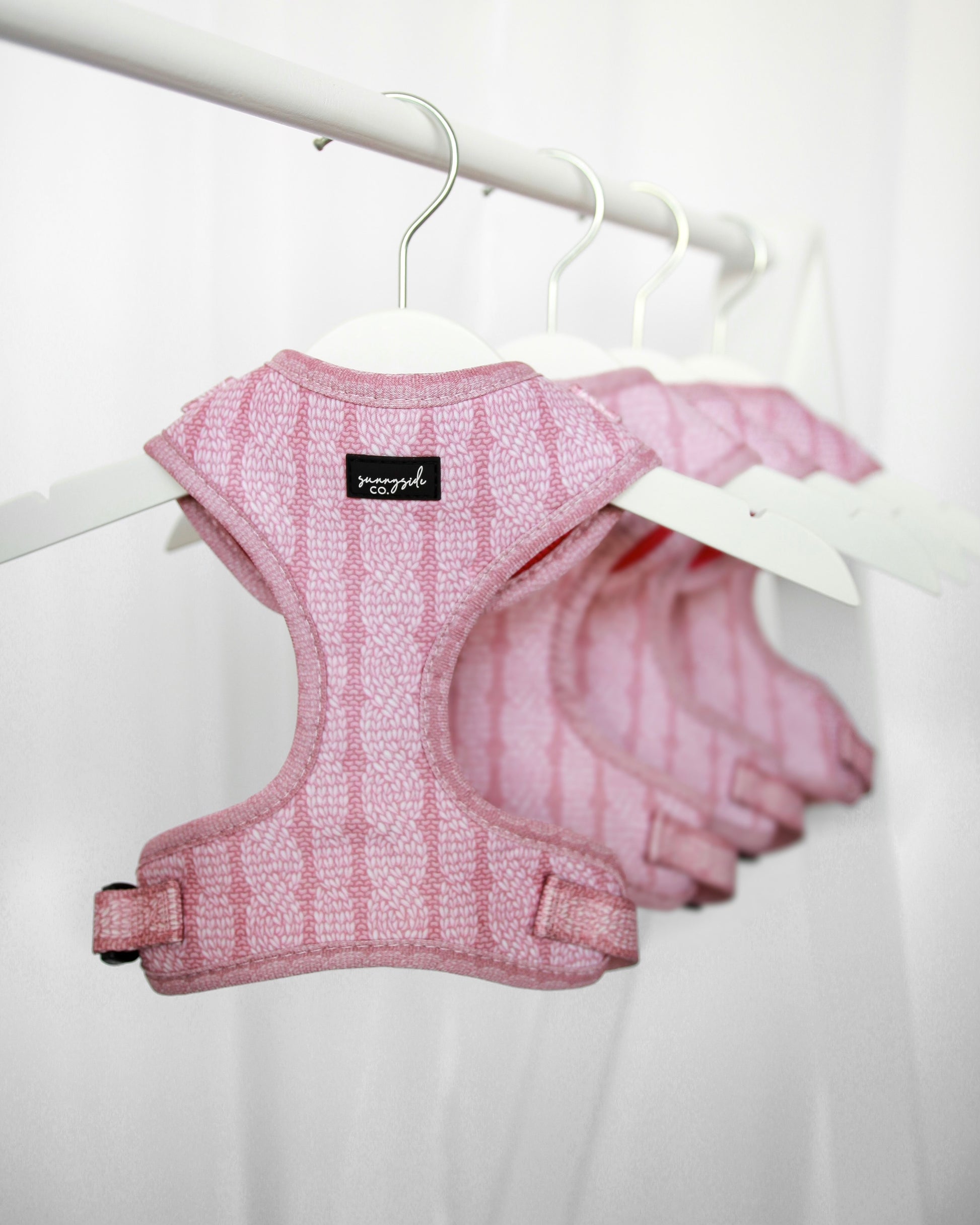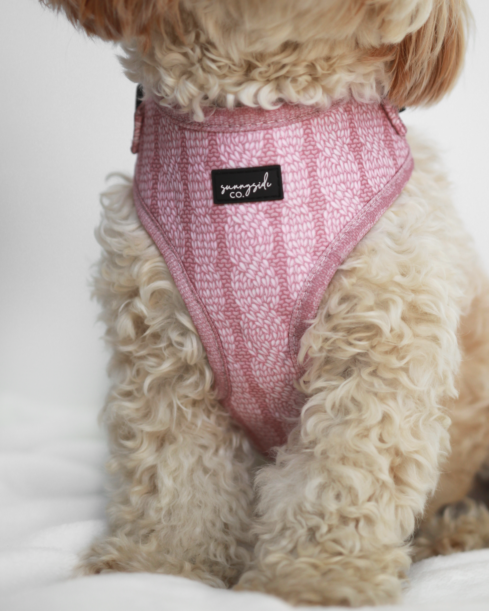 The 'Stitched with Love' adjustable harness features a beautiful cable knit design. Perfect for the most stylish pups in the park! It's a beautiful shade of dusky pink.