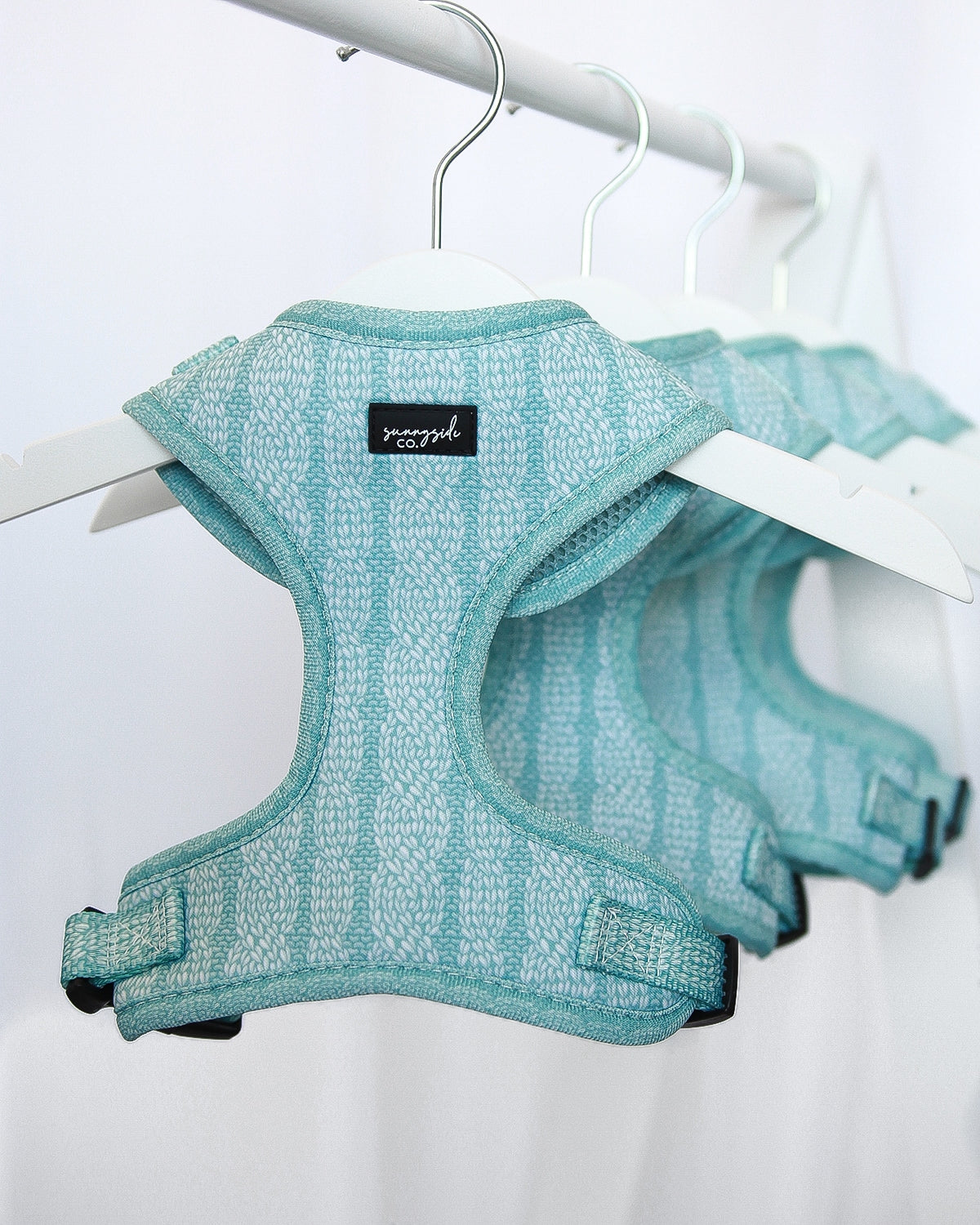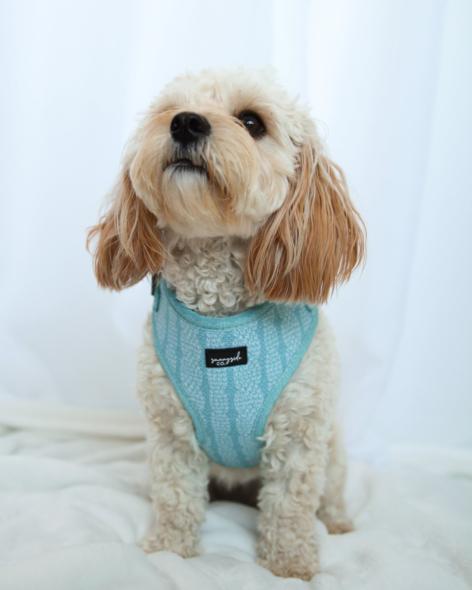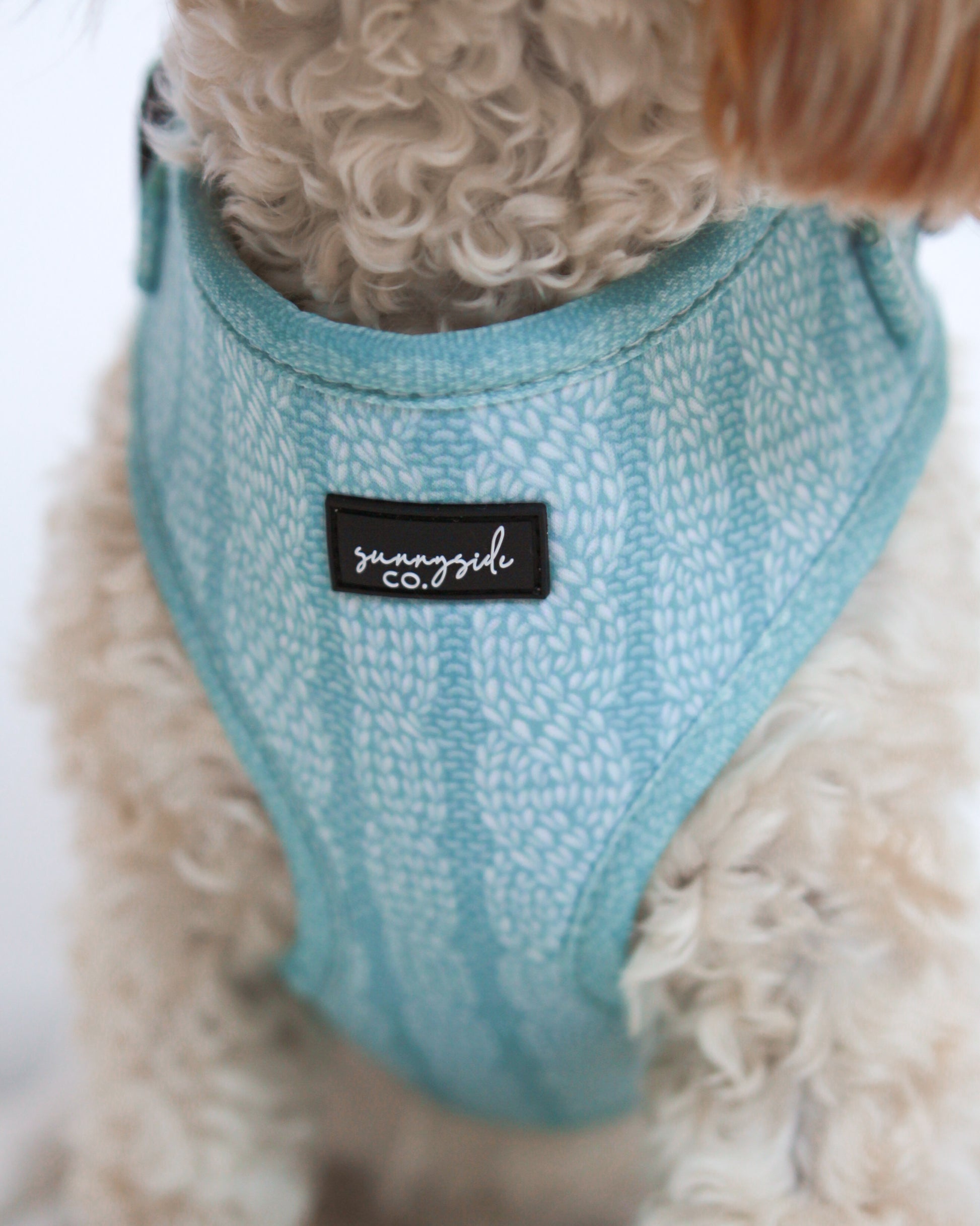 The 'Stitched with Love' adjustable harness is available in 5 beautiful colours. It features a unique cable knit design, perfect for the most stylish pups! This is a beautiful shade of light blue. It looks amazing on boys or girls!