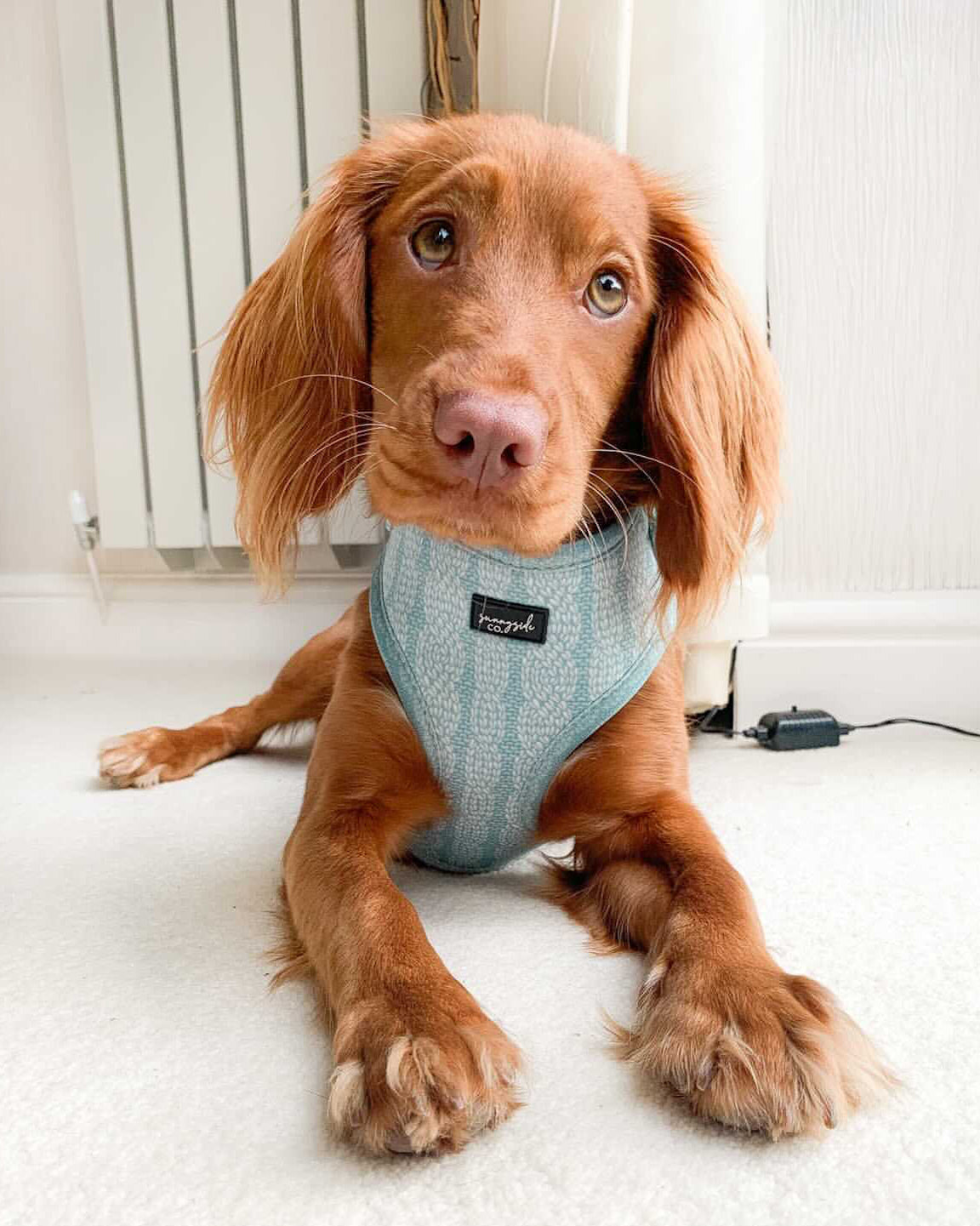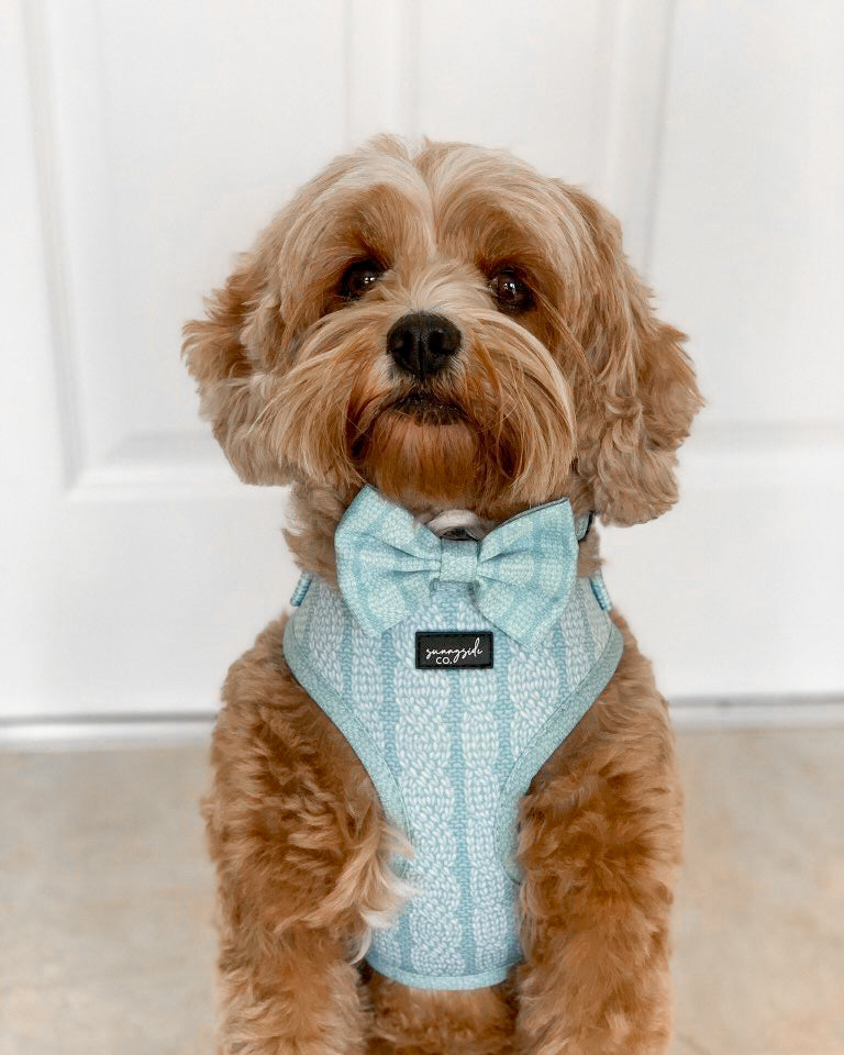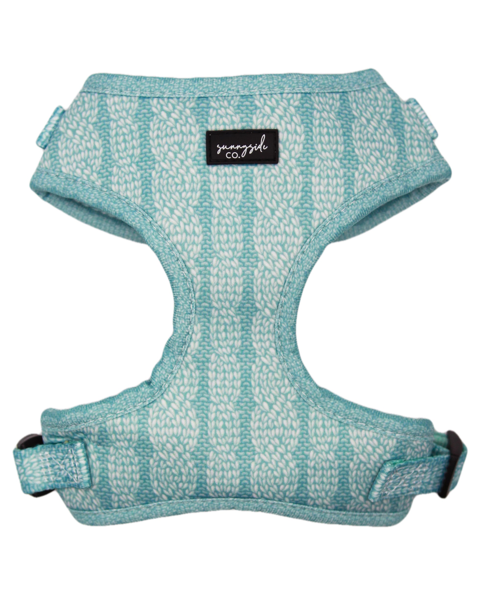 The 'Stitched with Love' adjustable harness is available in 5 beautiful colours. It features a unique cable knit design, perfect for the most stylish pups! This is a beautiful shade of light blue. It looks amazing on boys or girls!