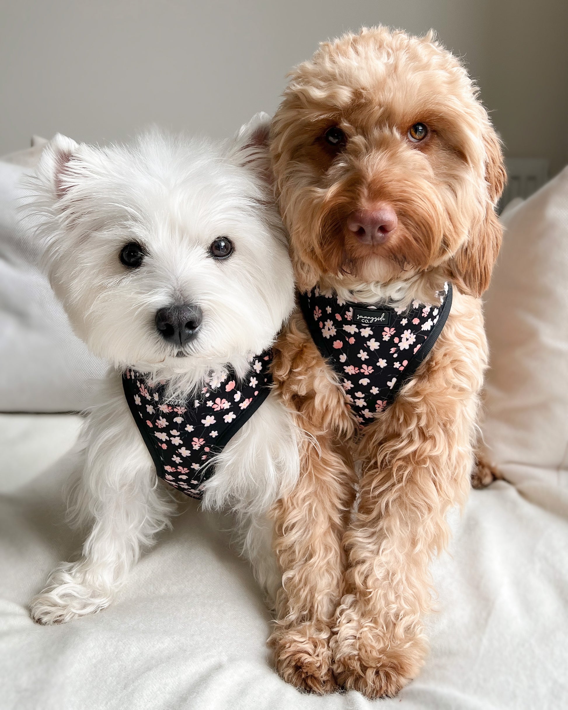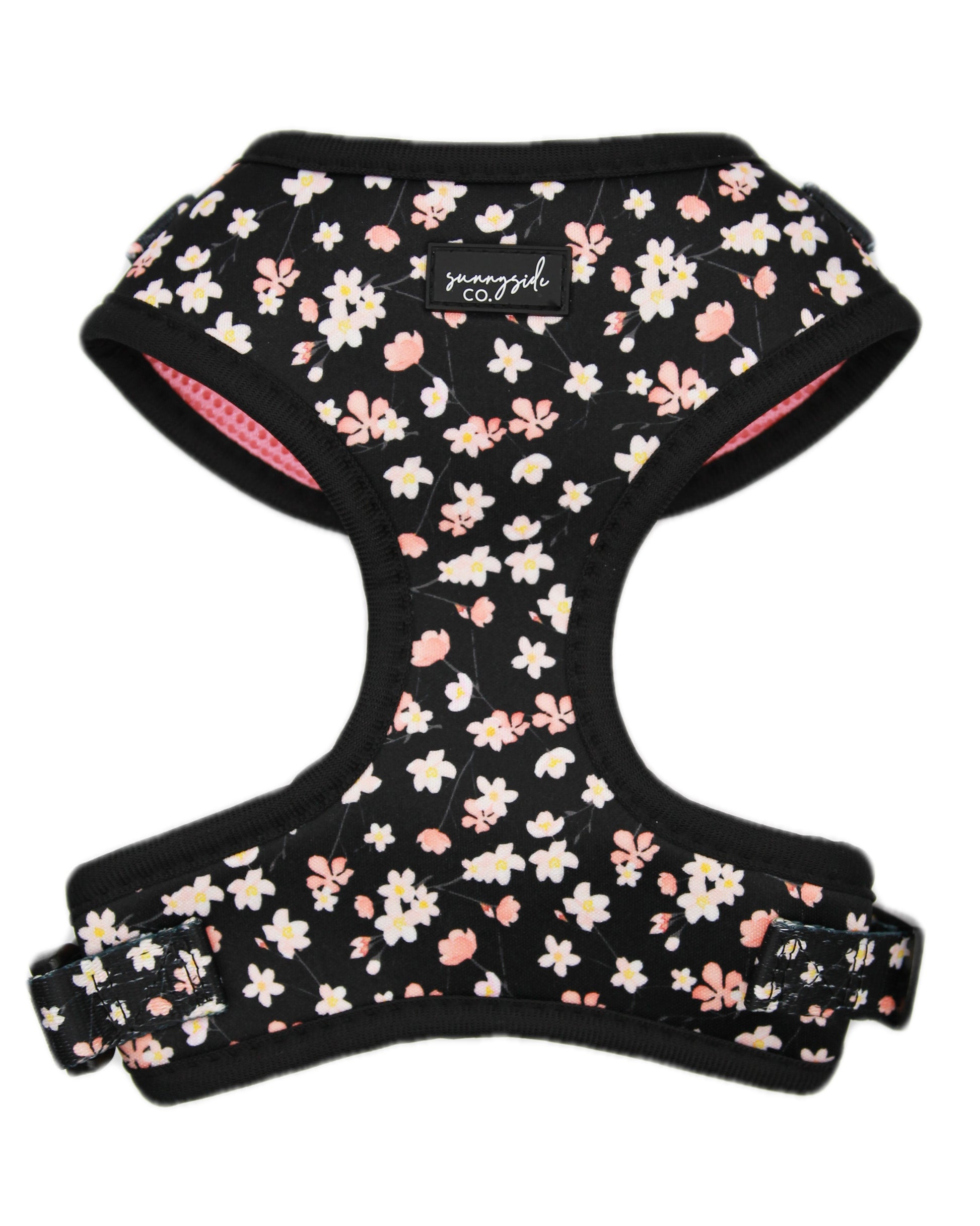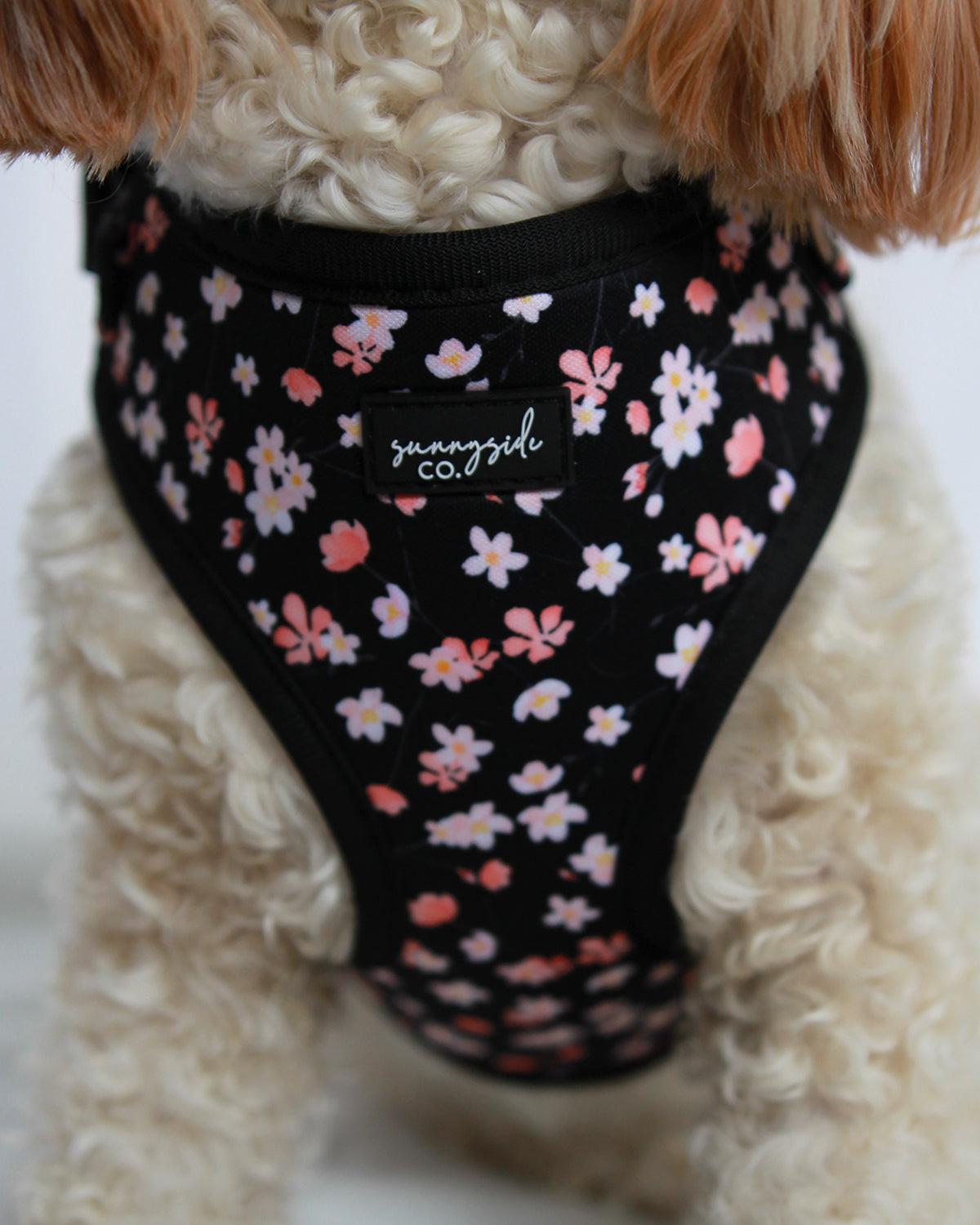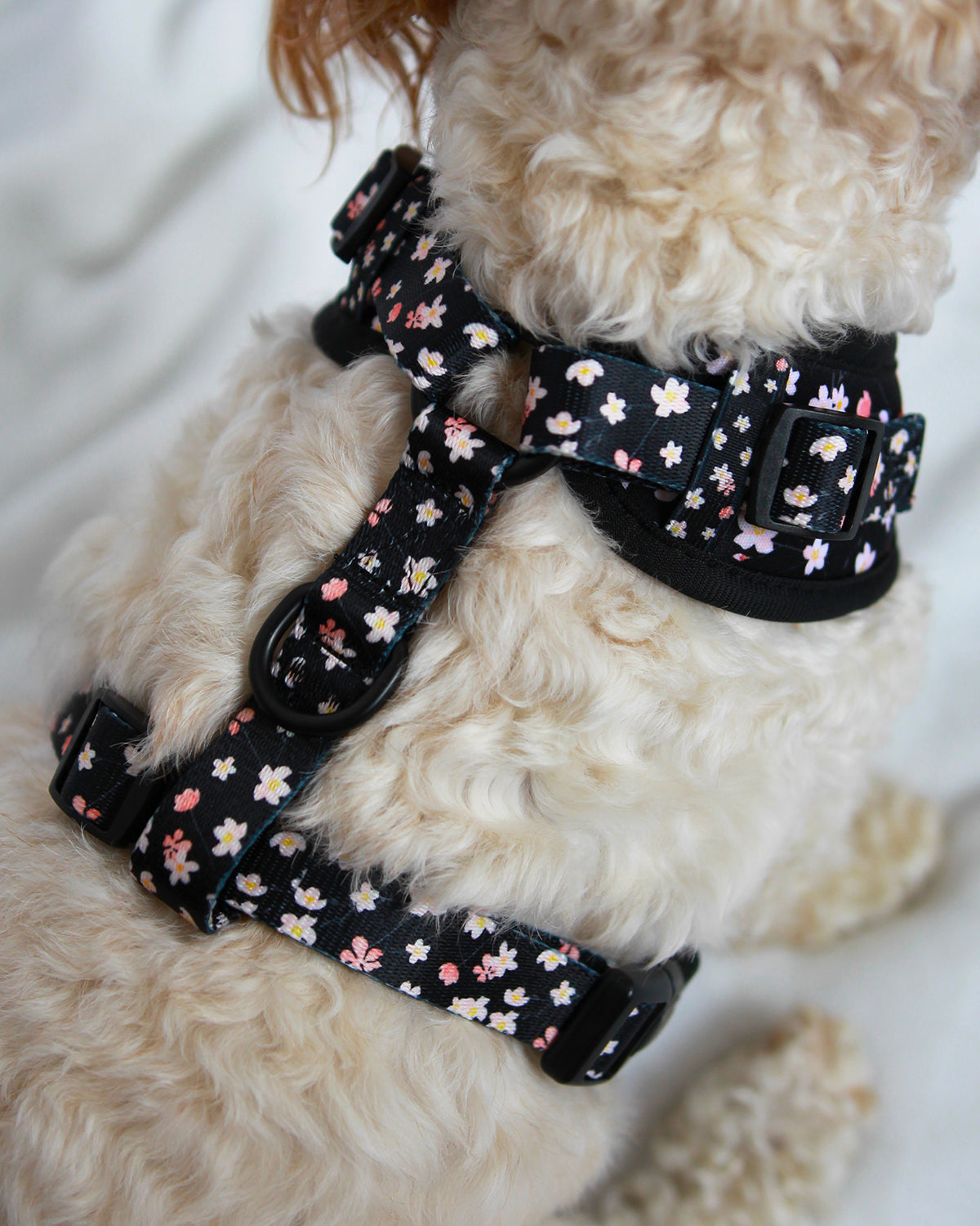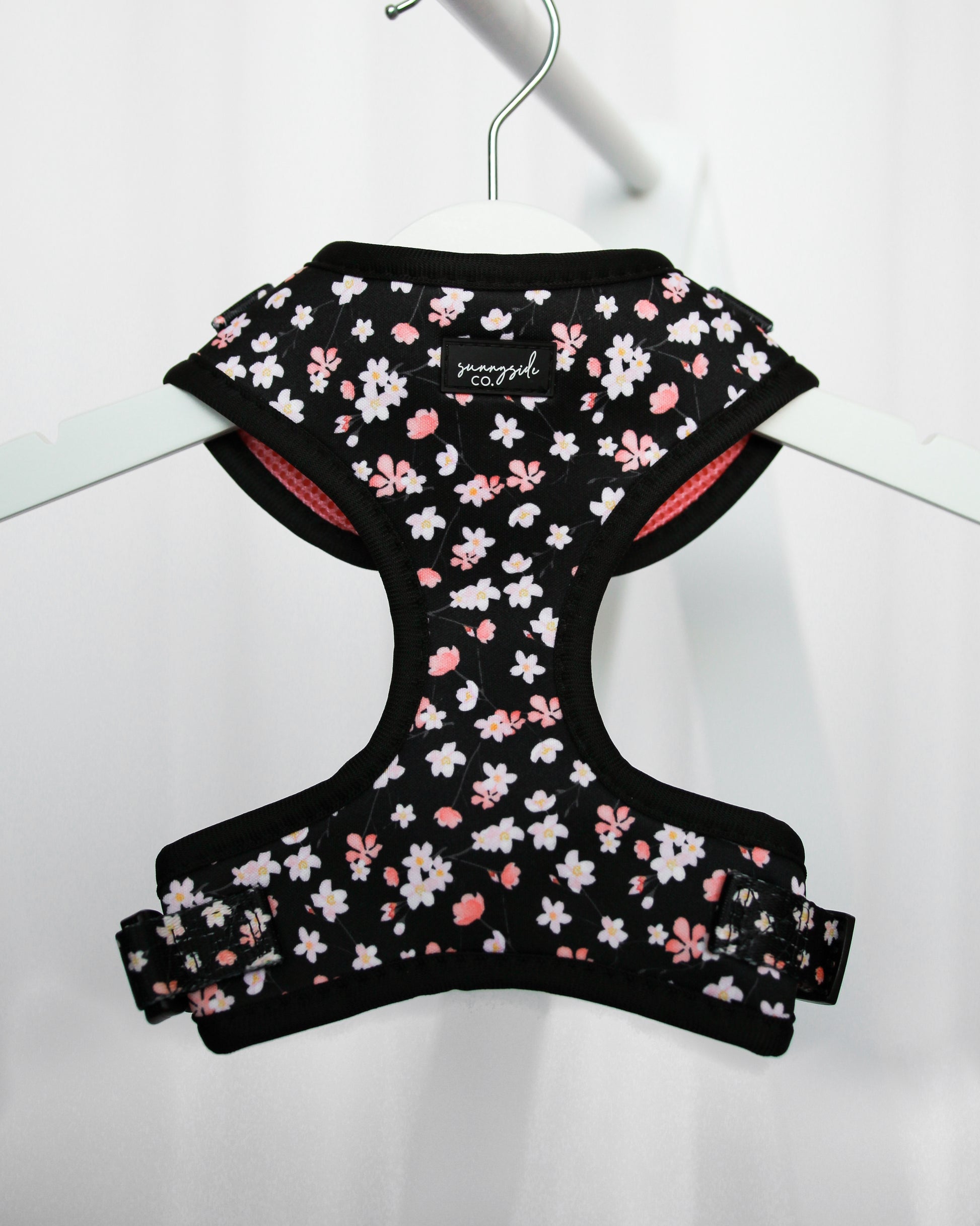 The 'Sweet Cherry Blossom' adjustable harness features a black background with contrasting pink Cherry Blossom flowers. It's perfect for Spring/Summer but also practical for wet weather too!