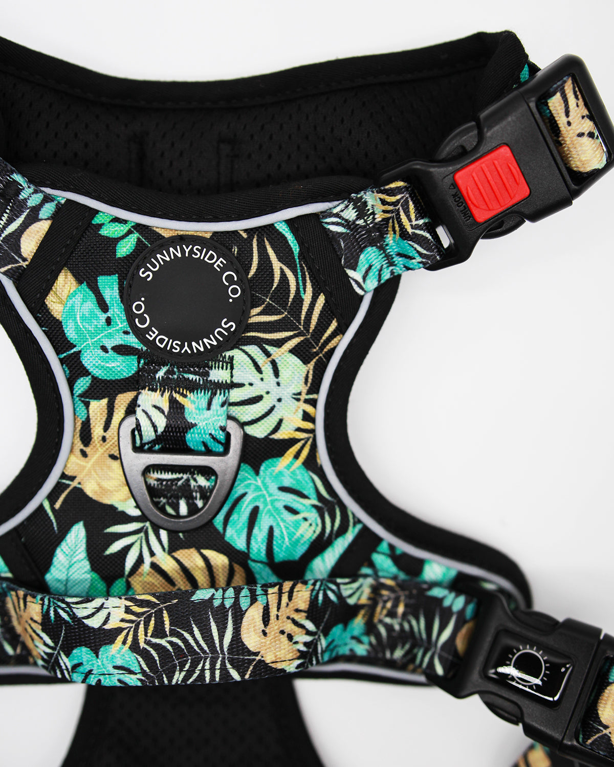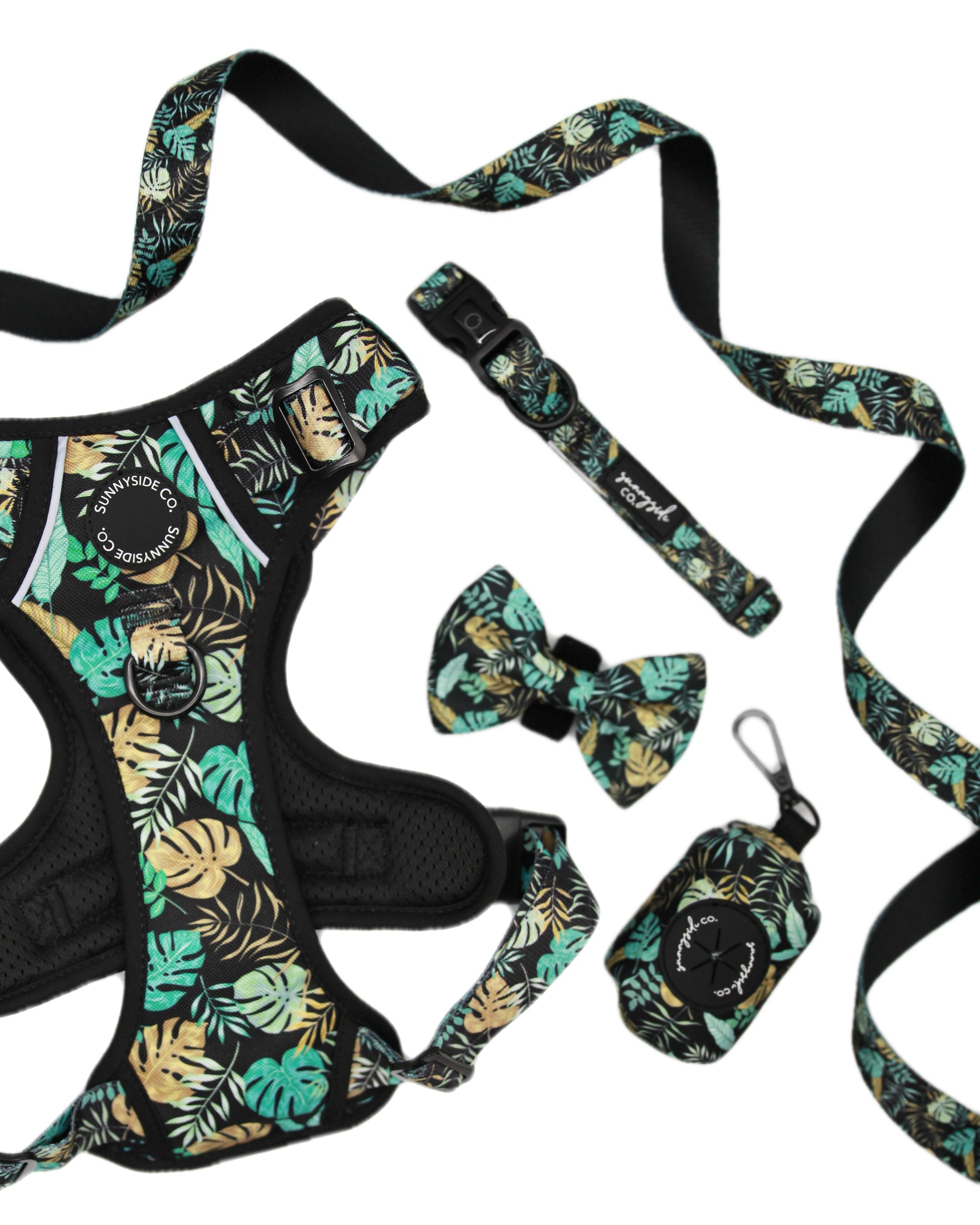 These beautiful, yet strong harnesses are perfect for larger breeds! Golden Palm features a black background with a variety of green and gold leaves. It’s classy but practical for mucky pups!