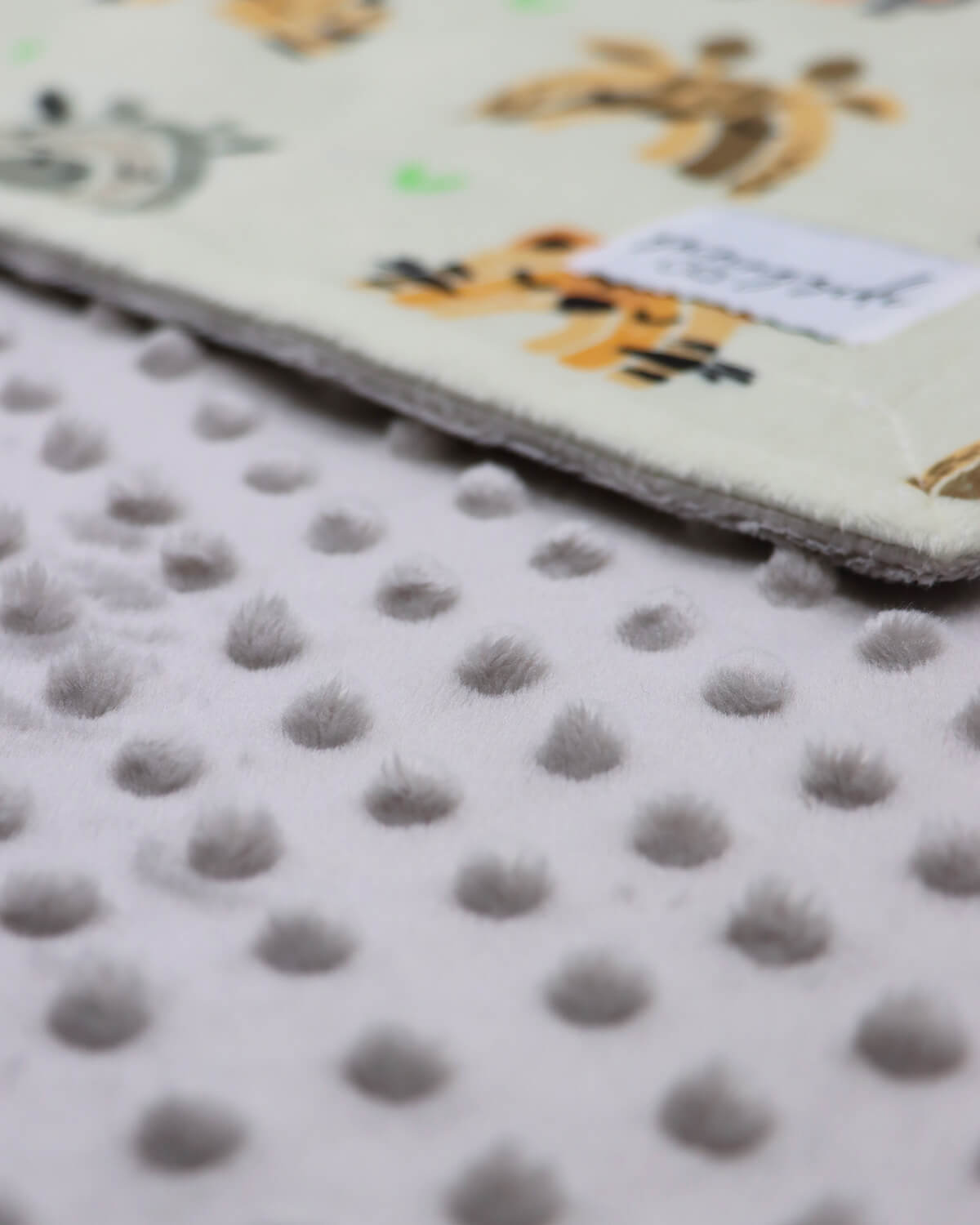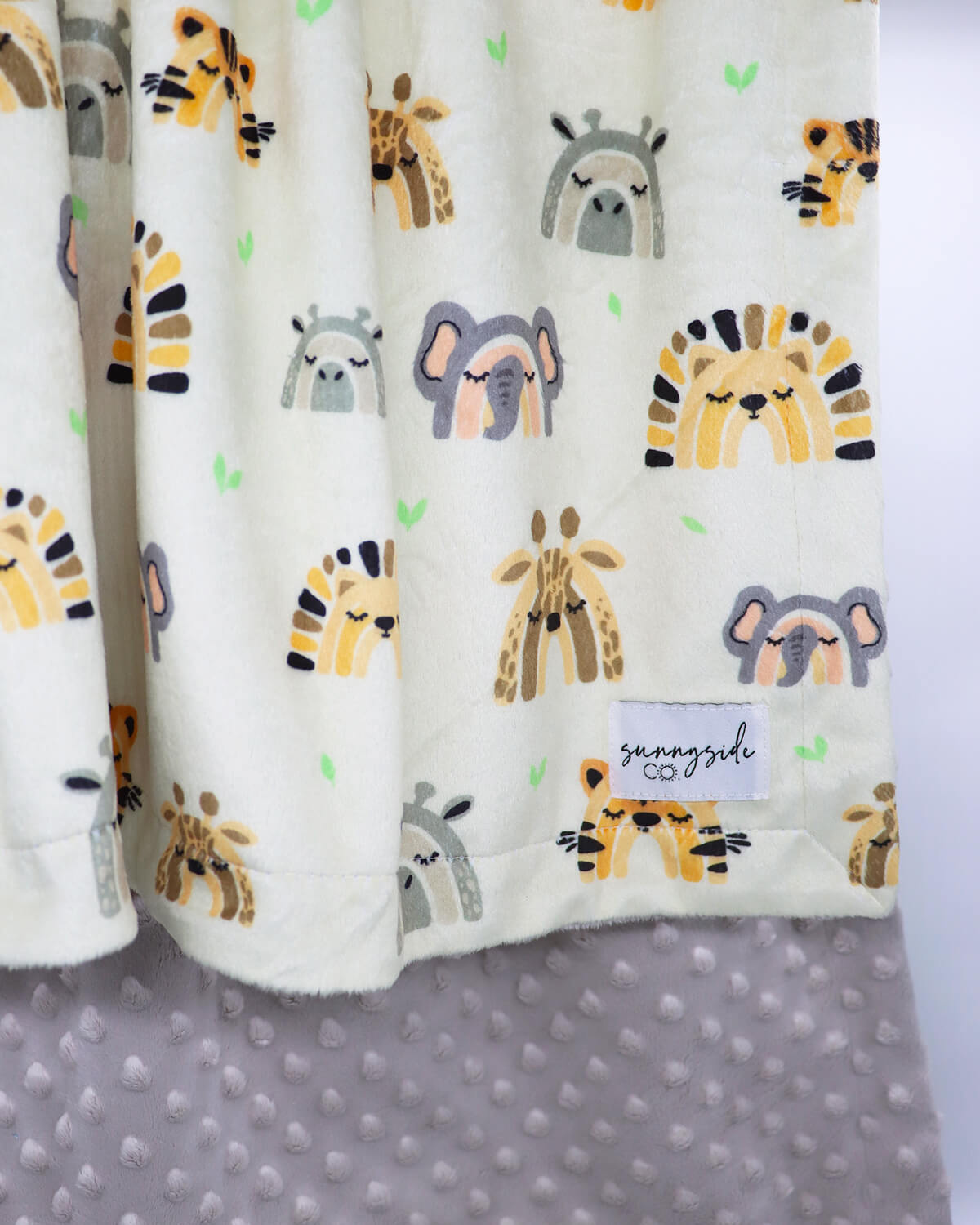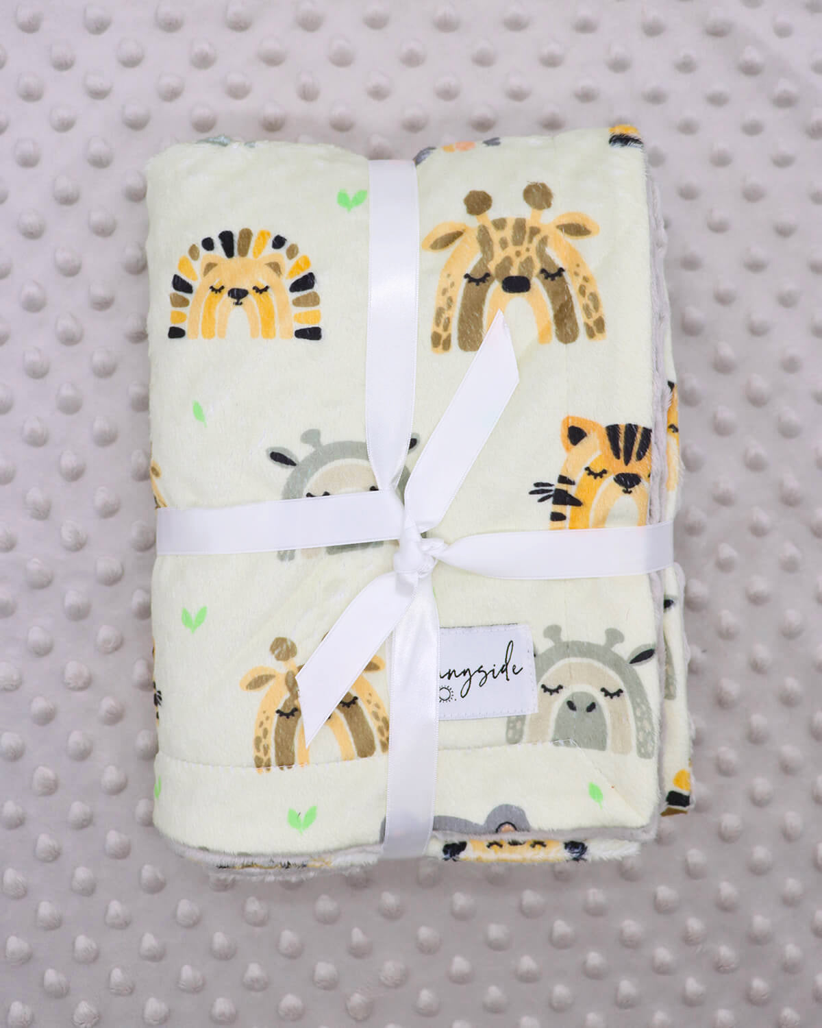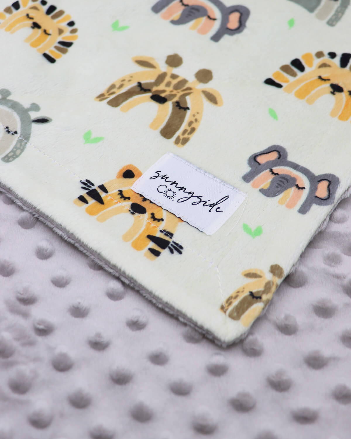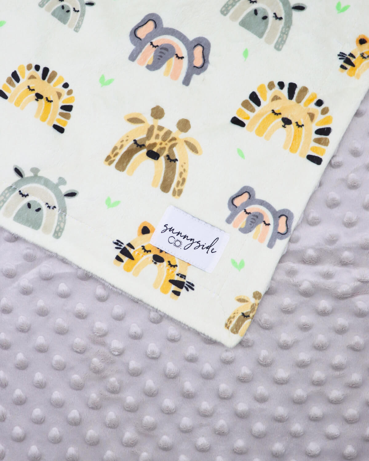 Our 'Rainforest Rainbows' blanket features beautiful boho-style jungle animals, designed in the shape of adorable rainbows.