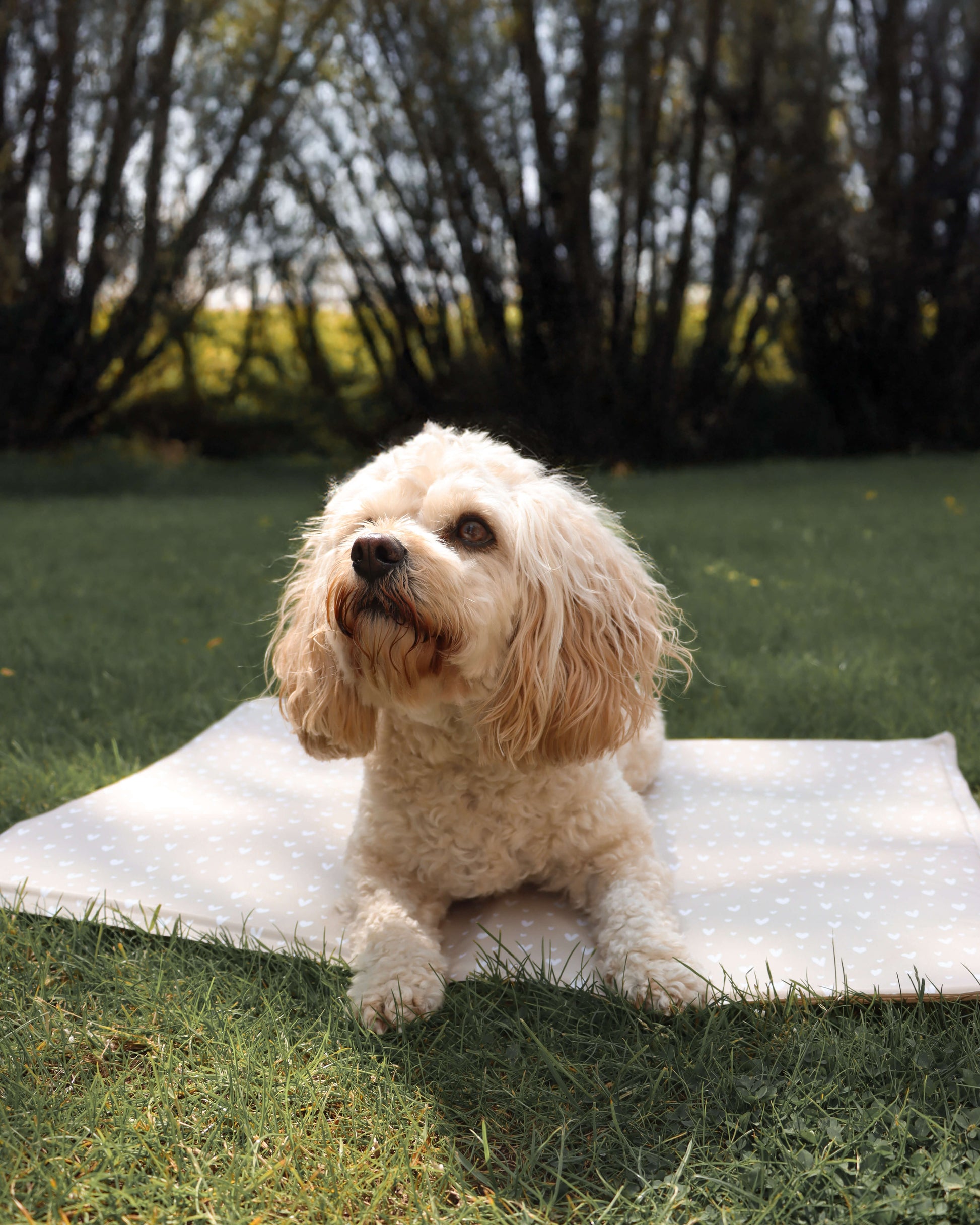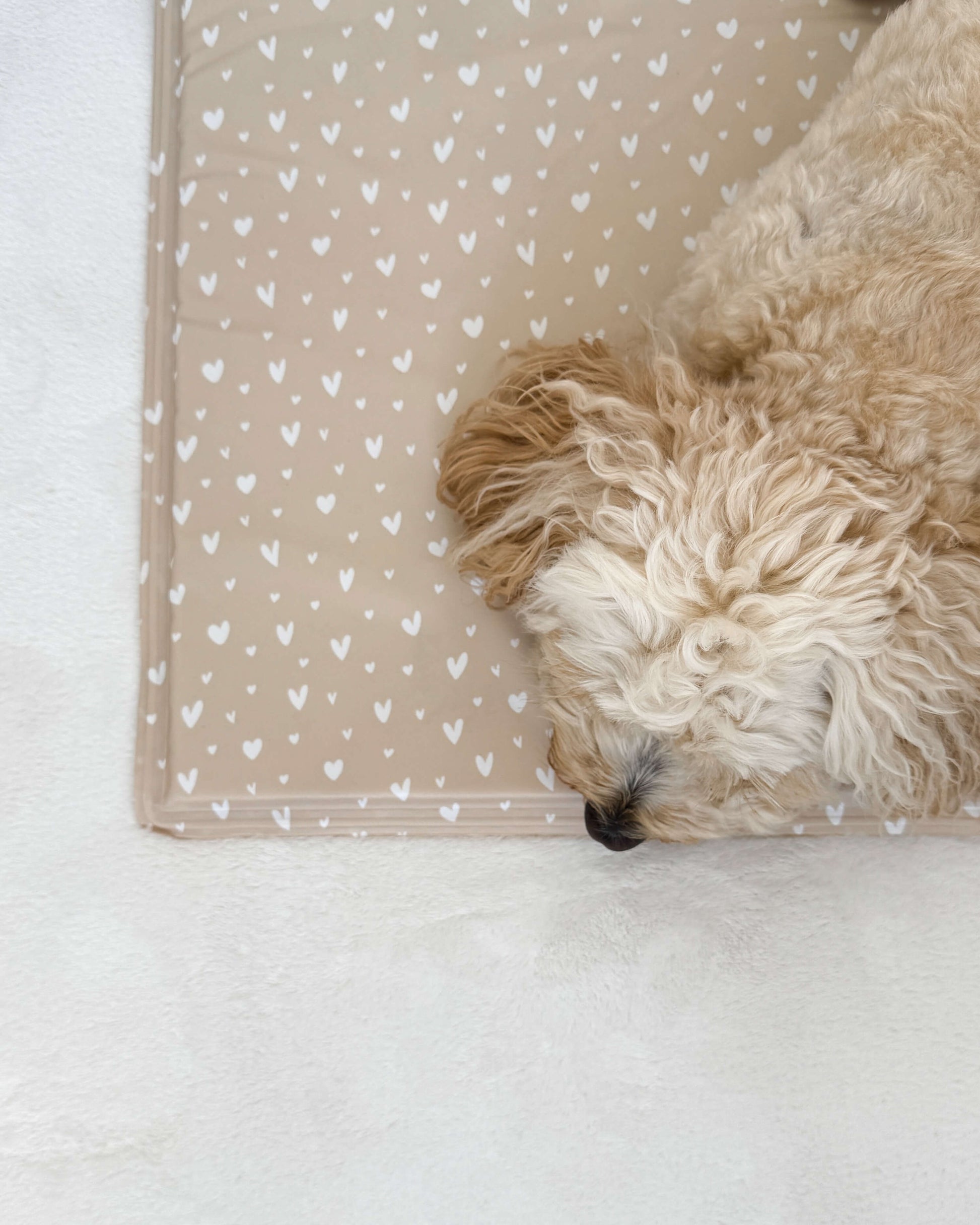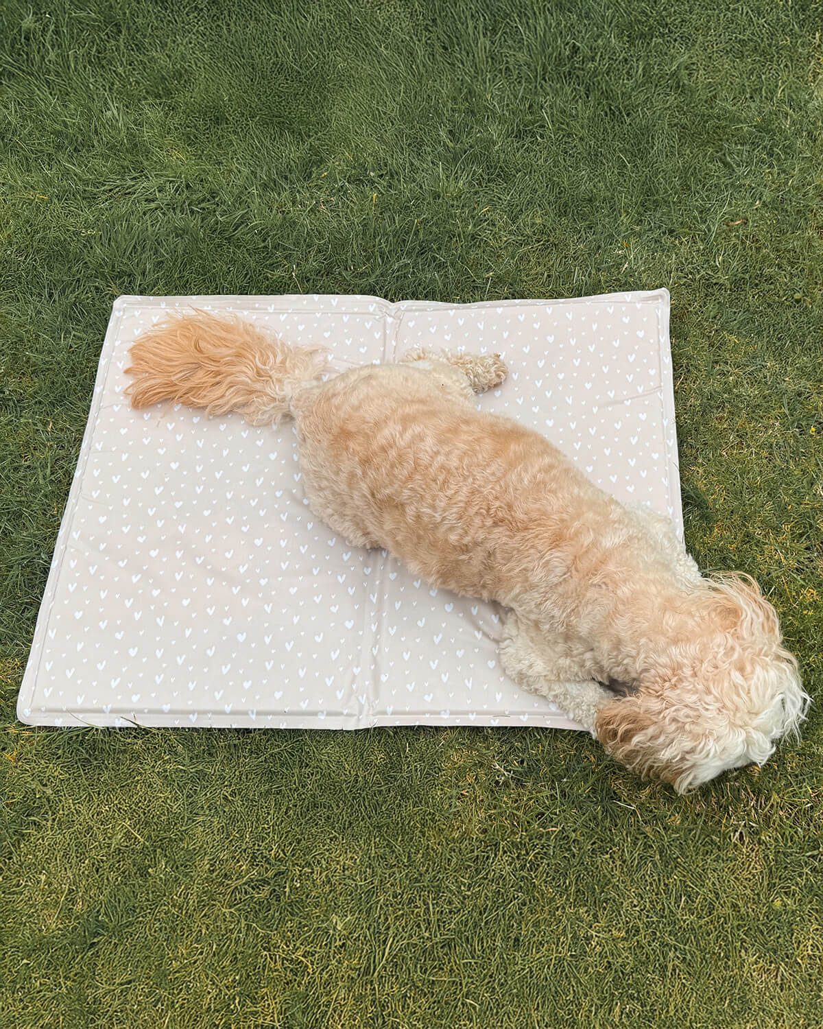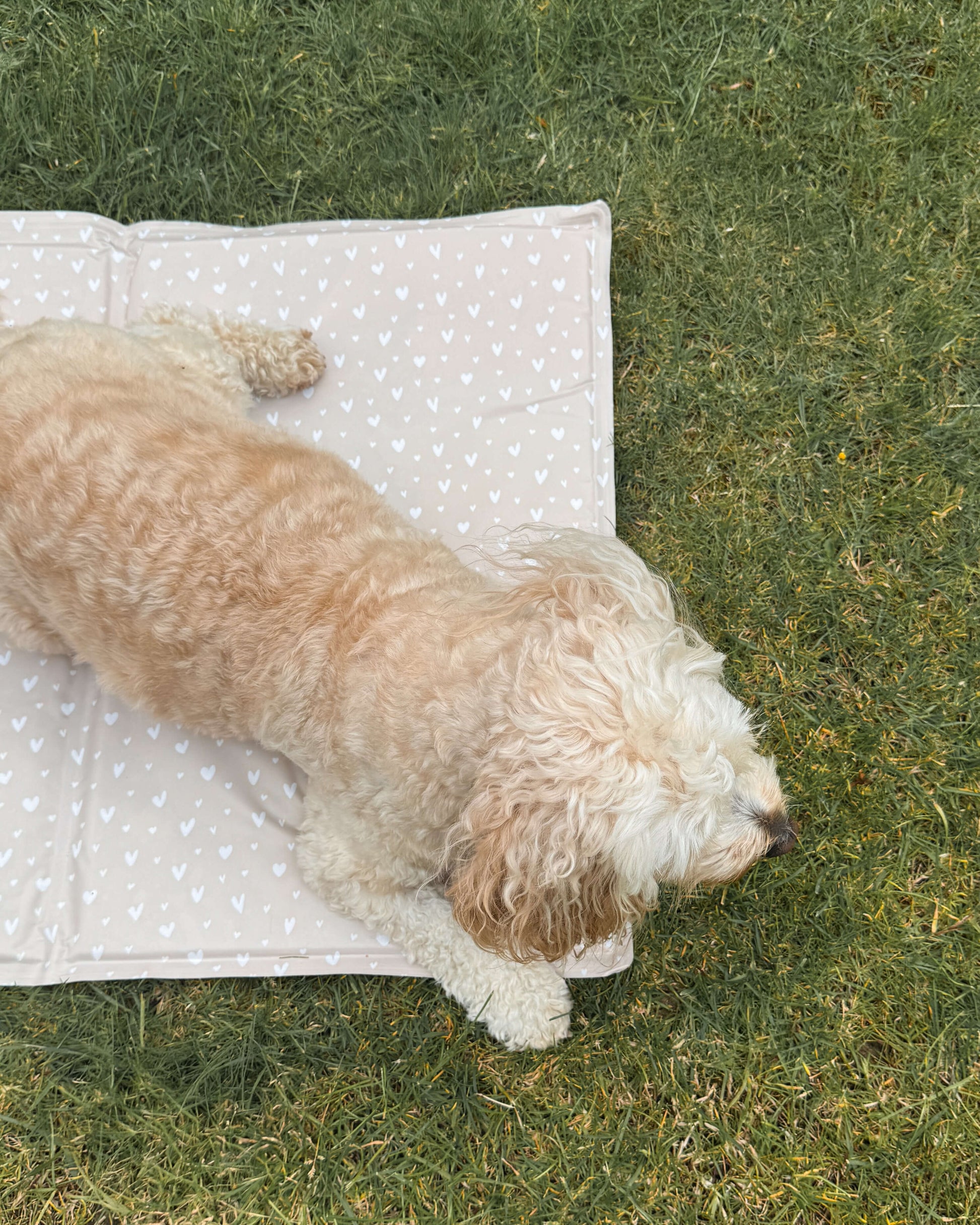 Keeping our pets cool is ALWAYS a priority, but if you’re tired of a bright blue cool mat cluttering your living room, our brand new neutral cool mats will fit seamlessly into your home. Our ‘Beauty in Beige’ cooling mat features white hand drawn hearts against with a warm beige background. Perfect for the cutest (but coolest!) pups