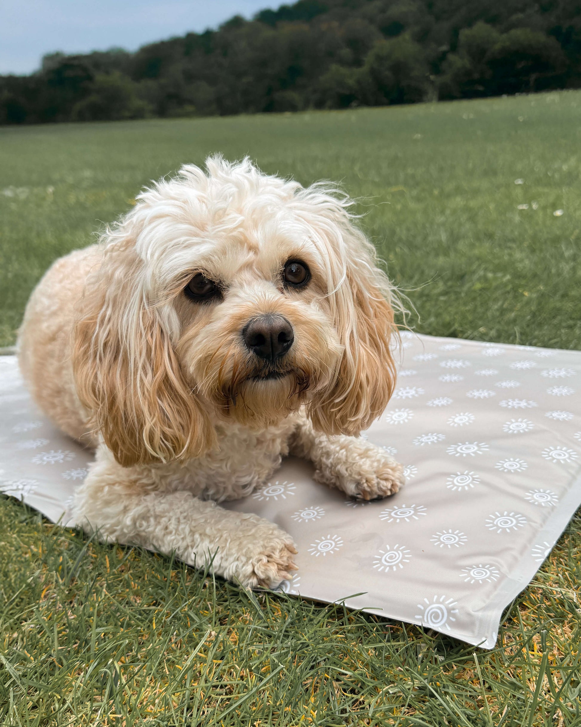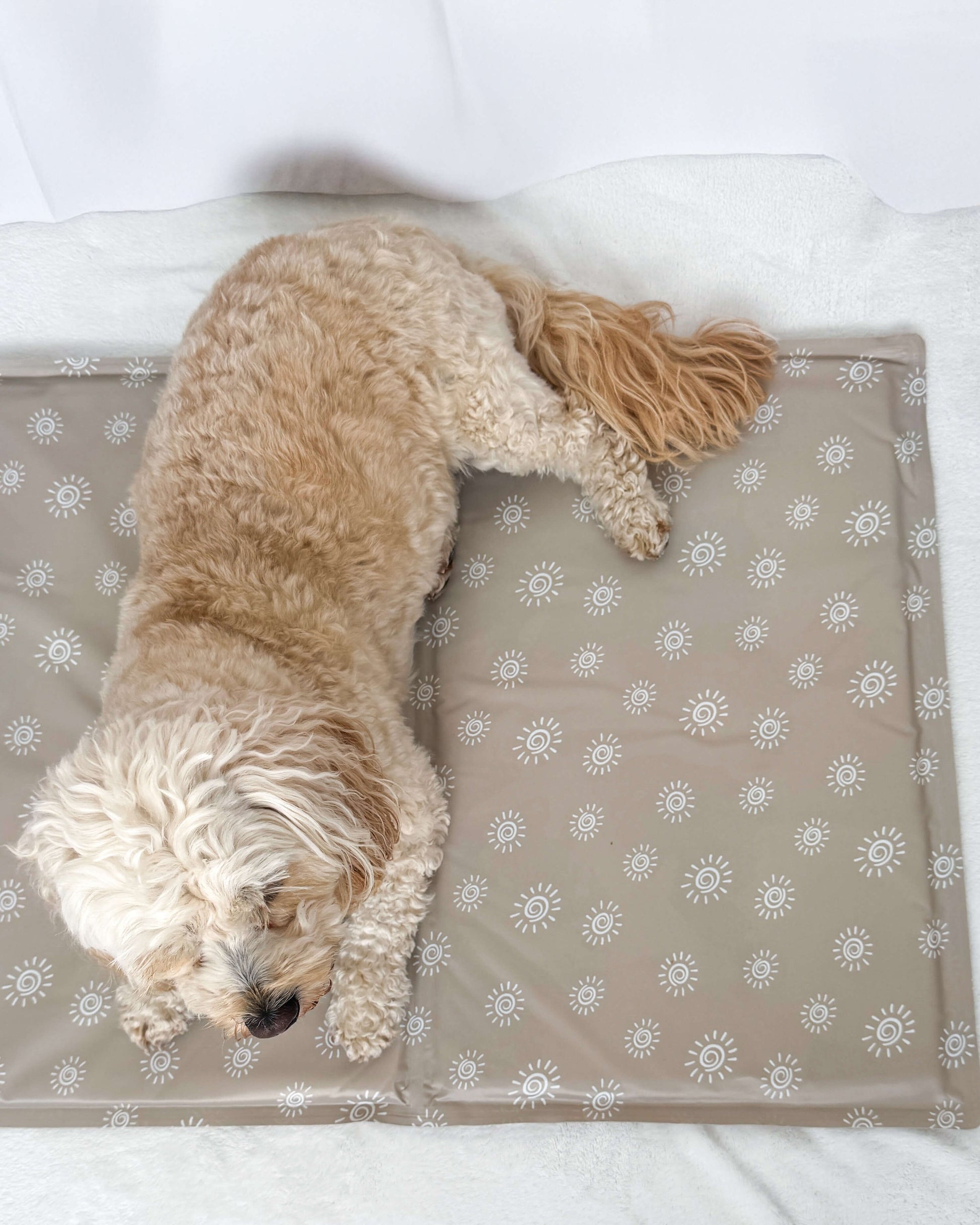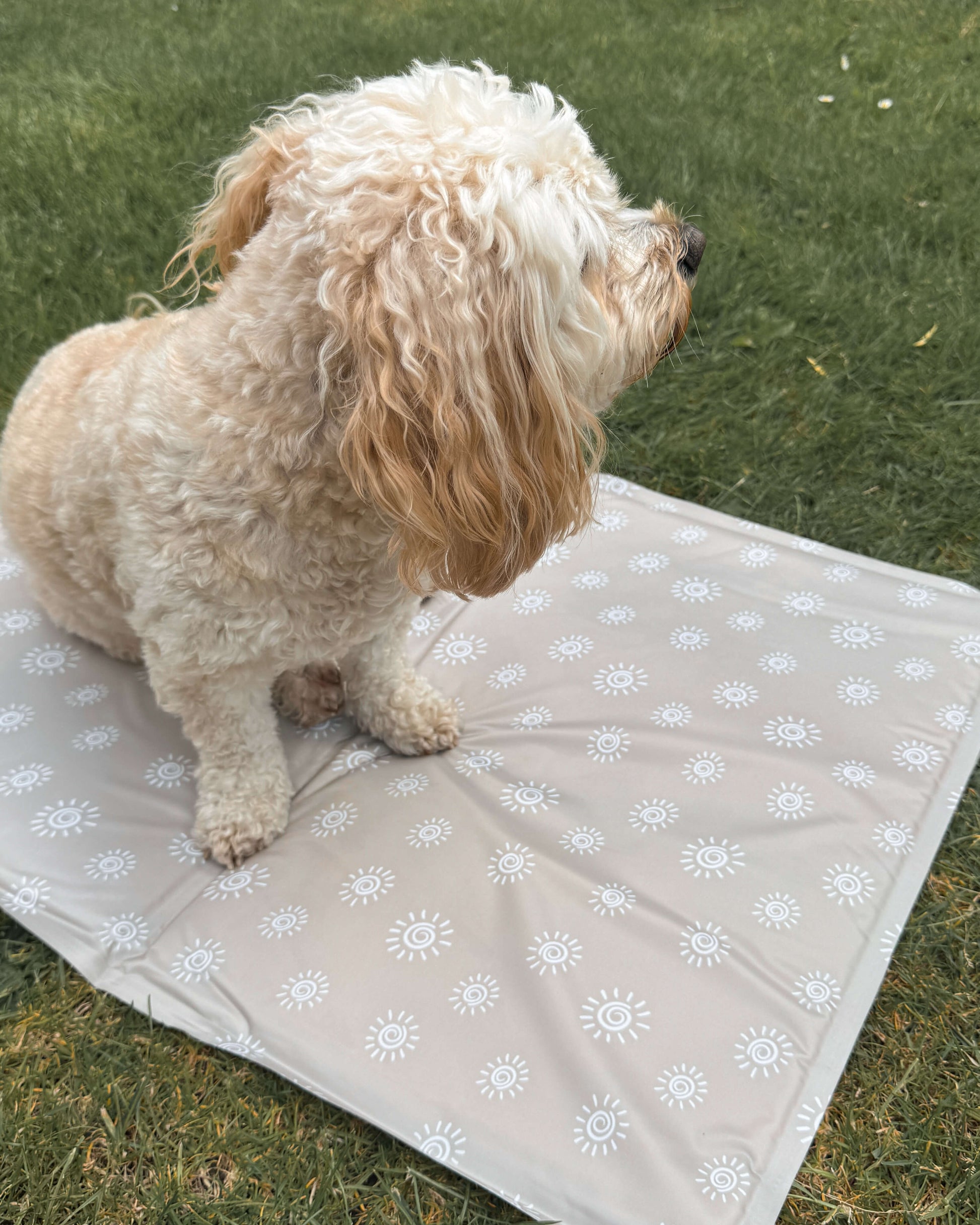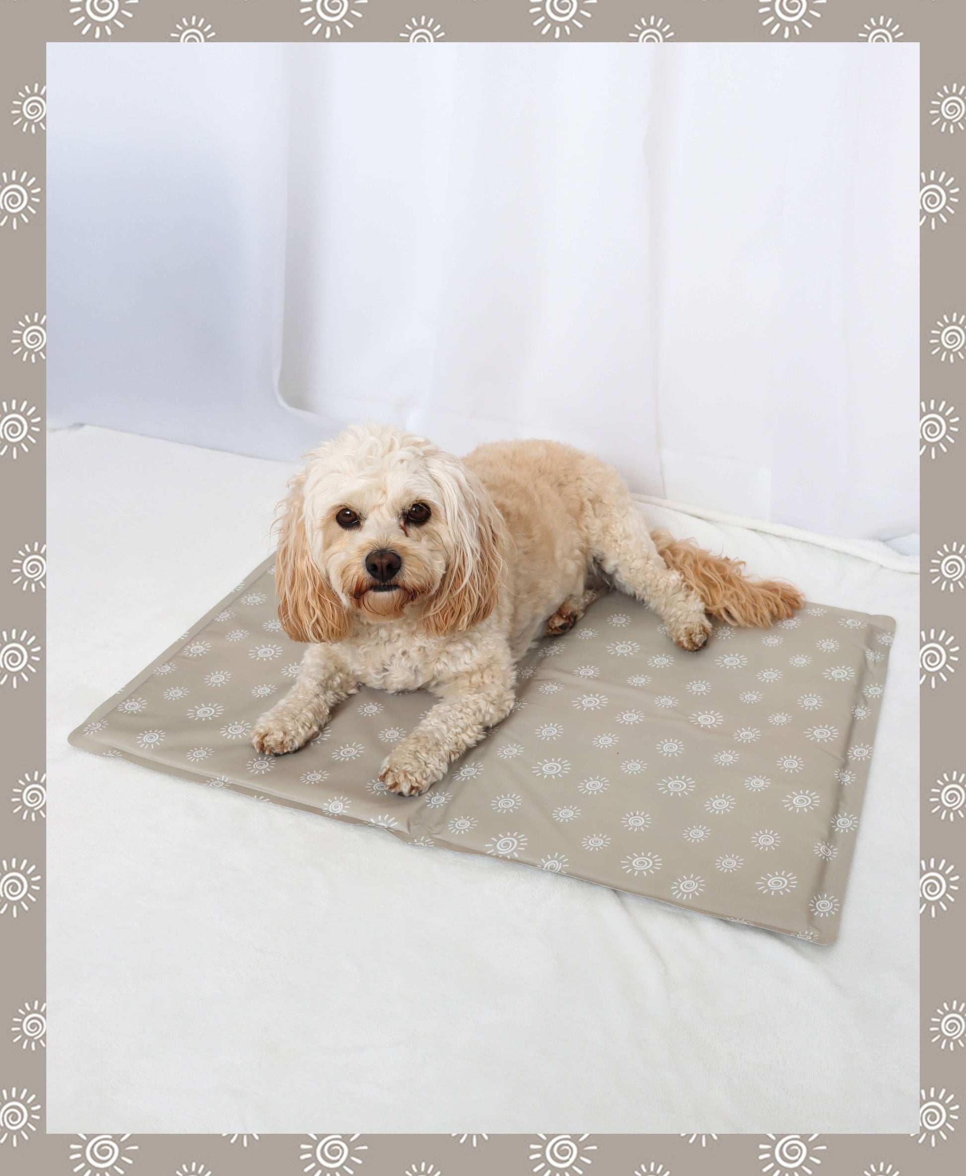 Keeping our pets cool is ALWAYS a priority, but if you’re tired of a bright blue cool mat cluttering your living room, our brand new neutral cool mats will fit seamlessly into your home. Our ‘Here Comes The Sun’ cooling mat features hand drawn sunshines with a cool beige background. This unisex design is perfect to keep any pup cool!