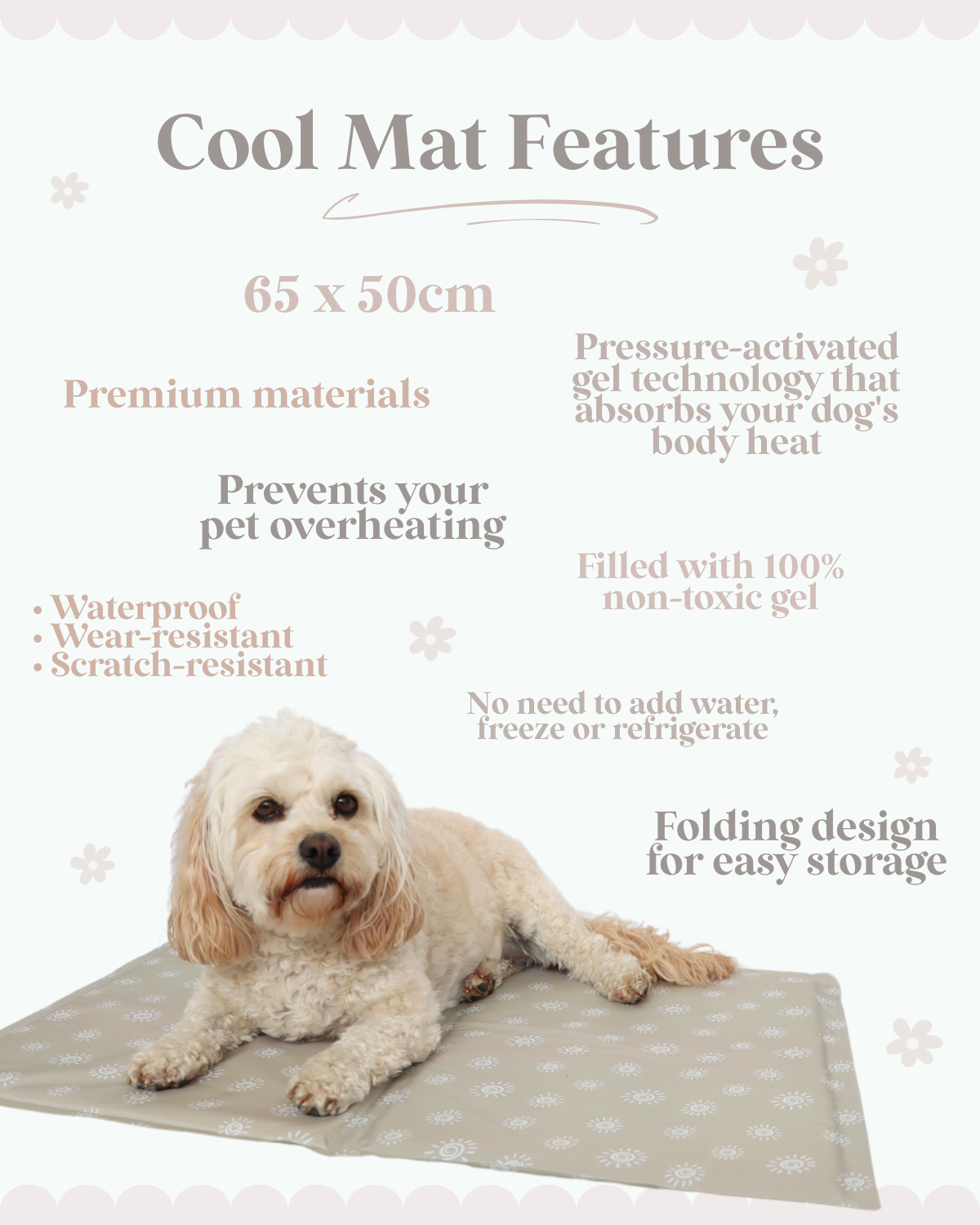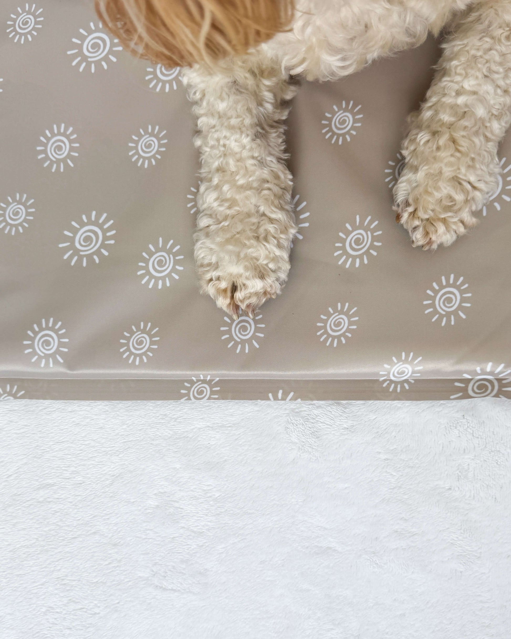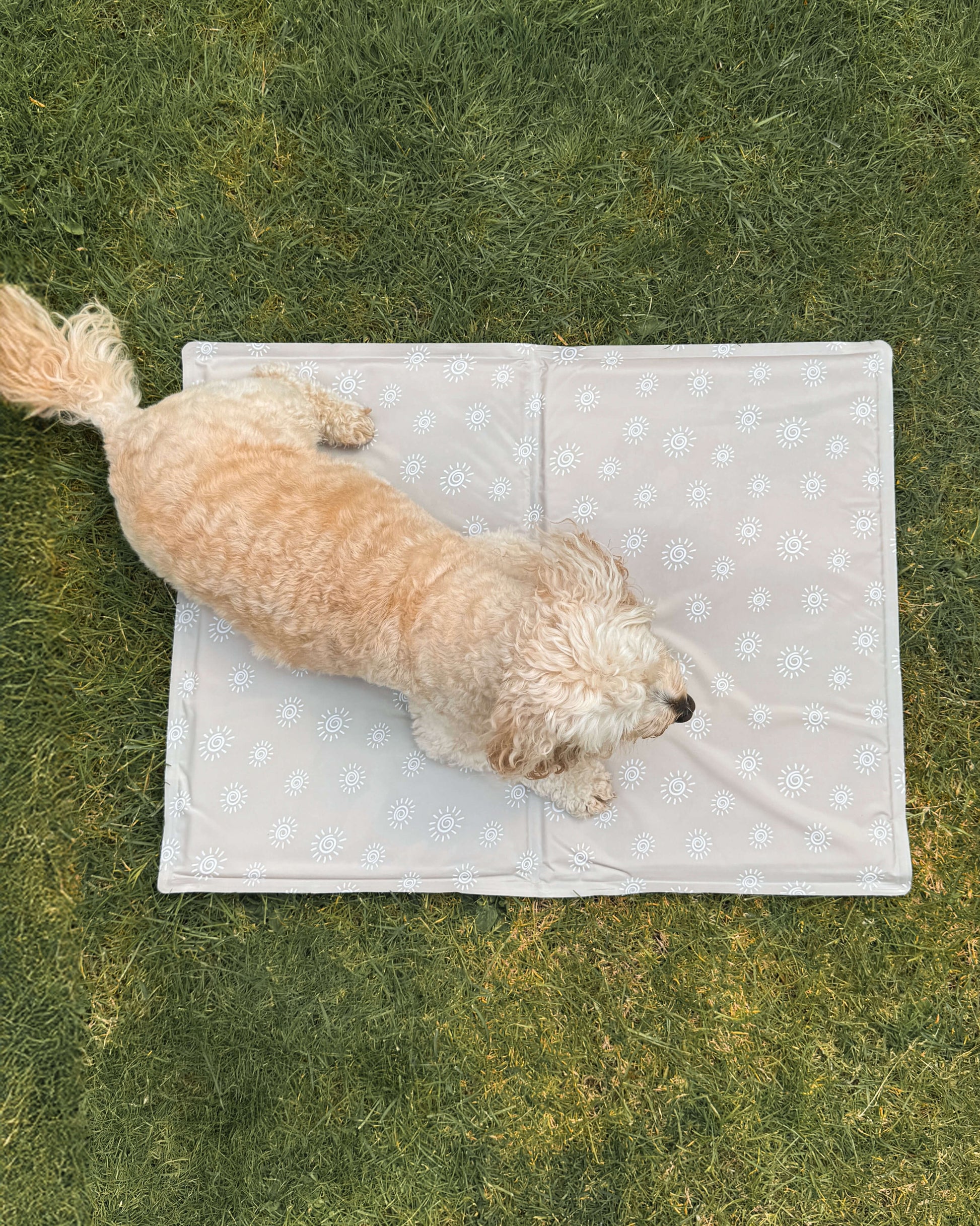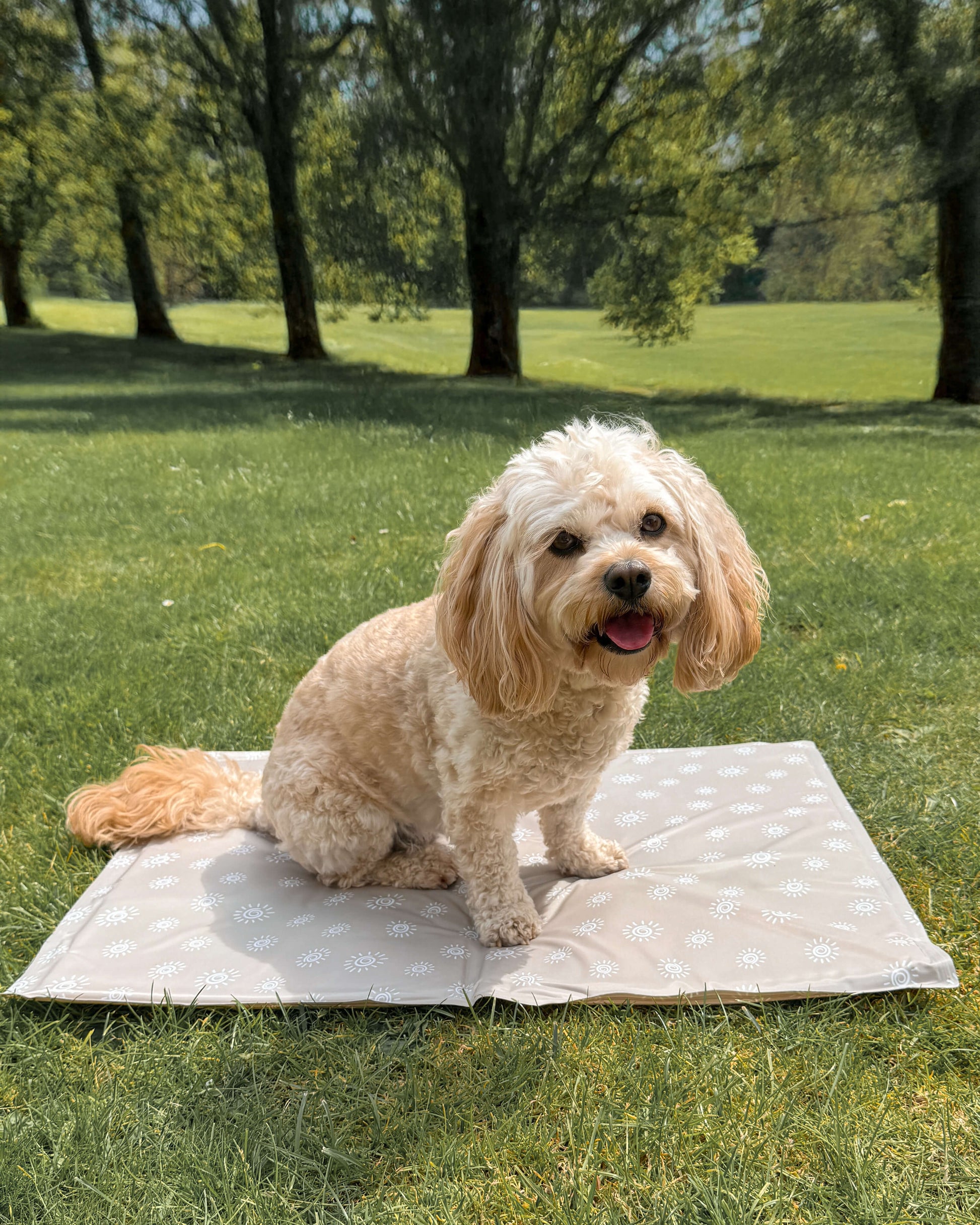 Keeping our pets cool is ALWAYS a priority, but if you’re tired of a bright blue cool mat cluttering your living room, our brand new neutral cool mats will fit seamlessly into your home. Our ‘Here Comes The Sun’ cooling mat features hand drawn sunshines with a cool beige background. This unisex design is perfect to keep any pup cool!