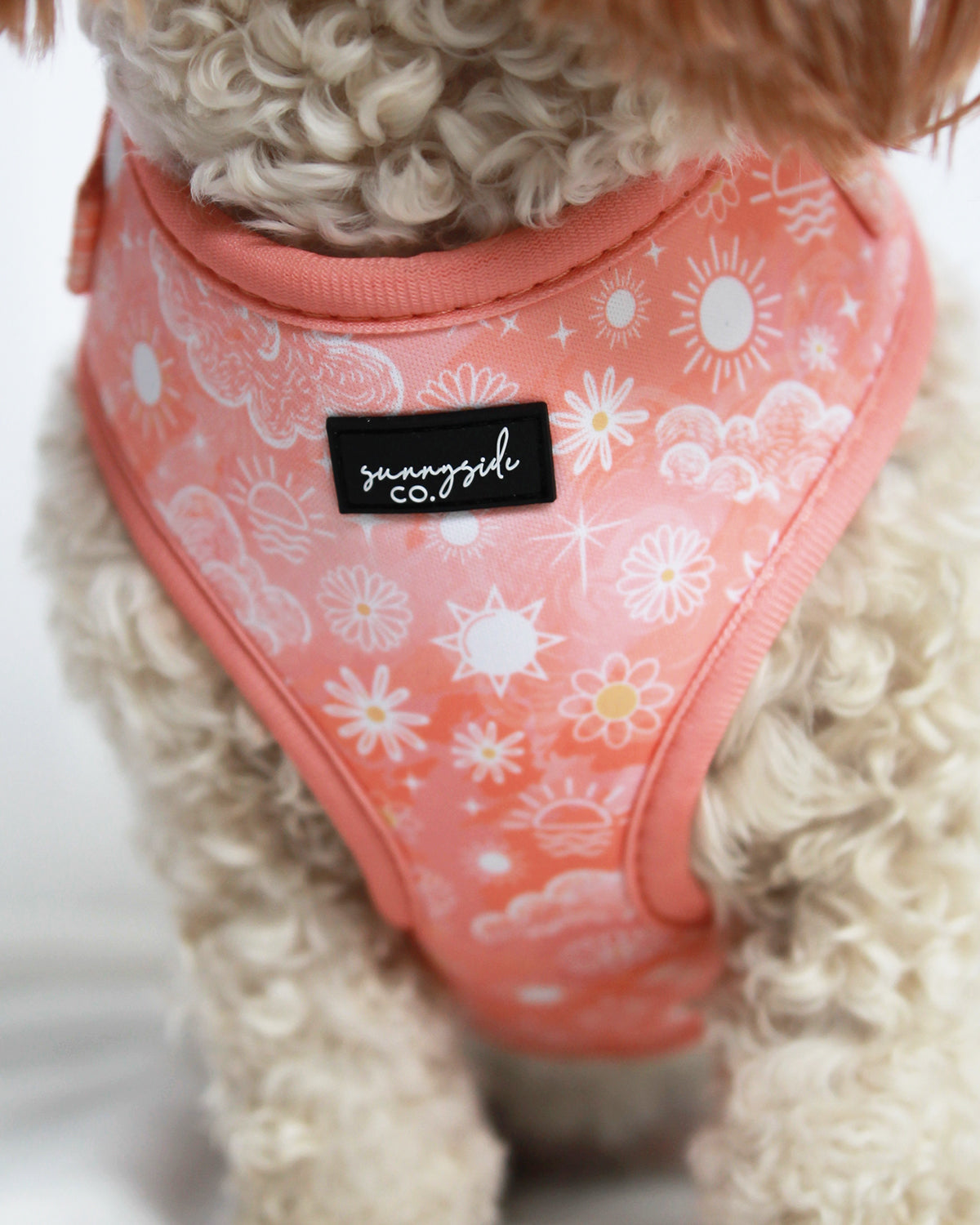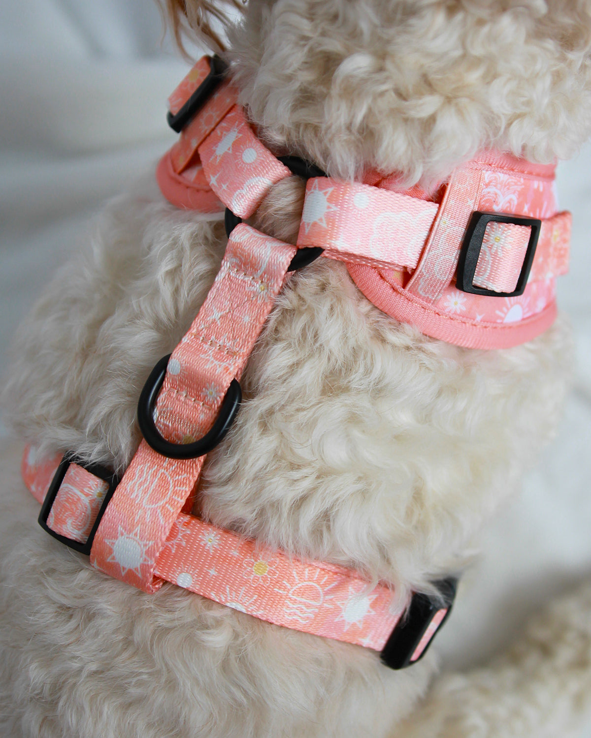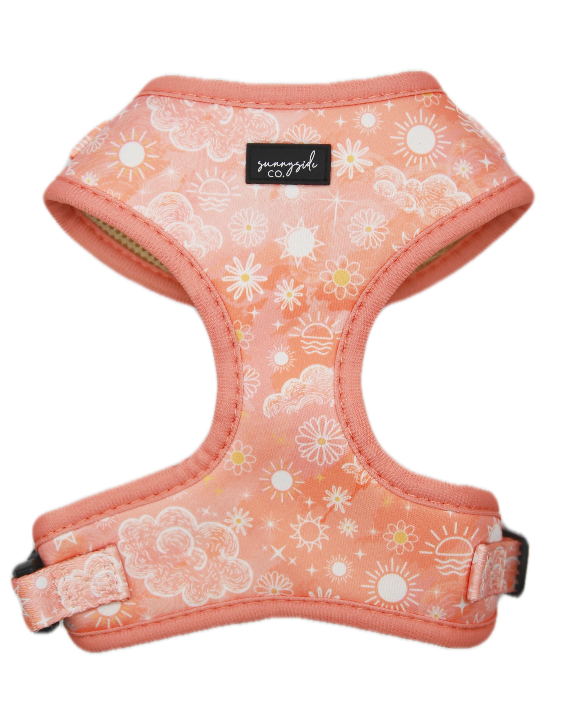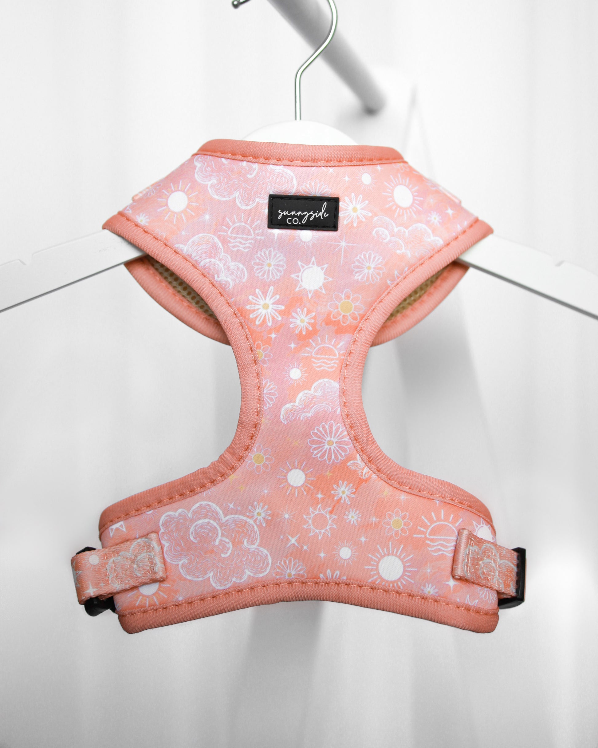 The 'Peach Sunrise' adjustable harness features a watercolour style background and the sweetest white details. Clouds, flowers and tiny sunshines galore!