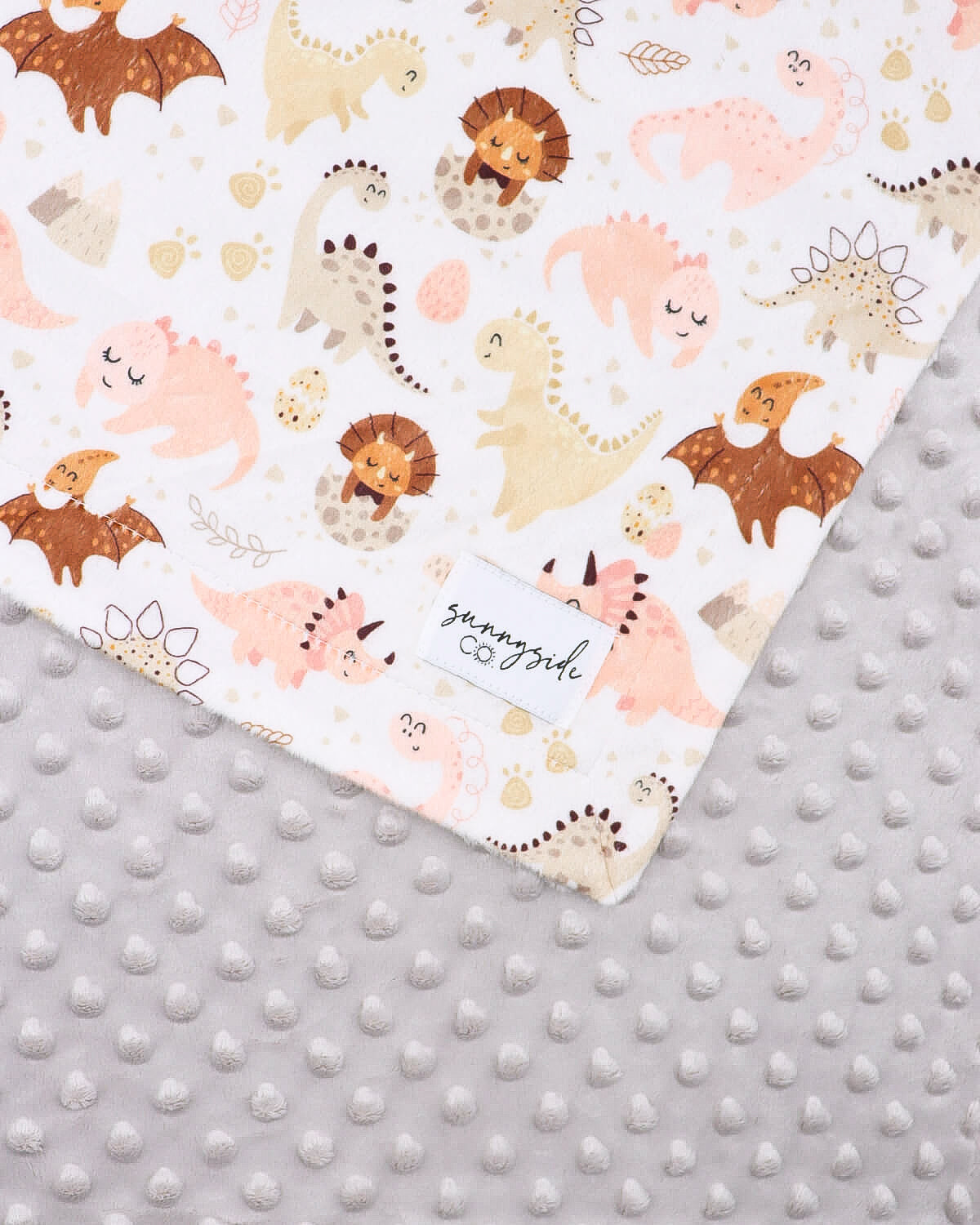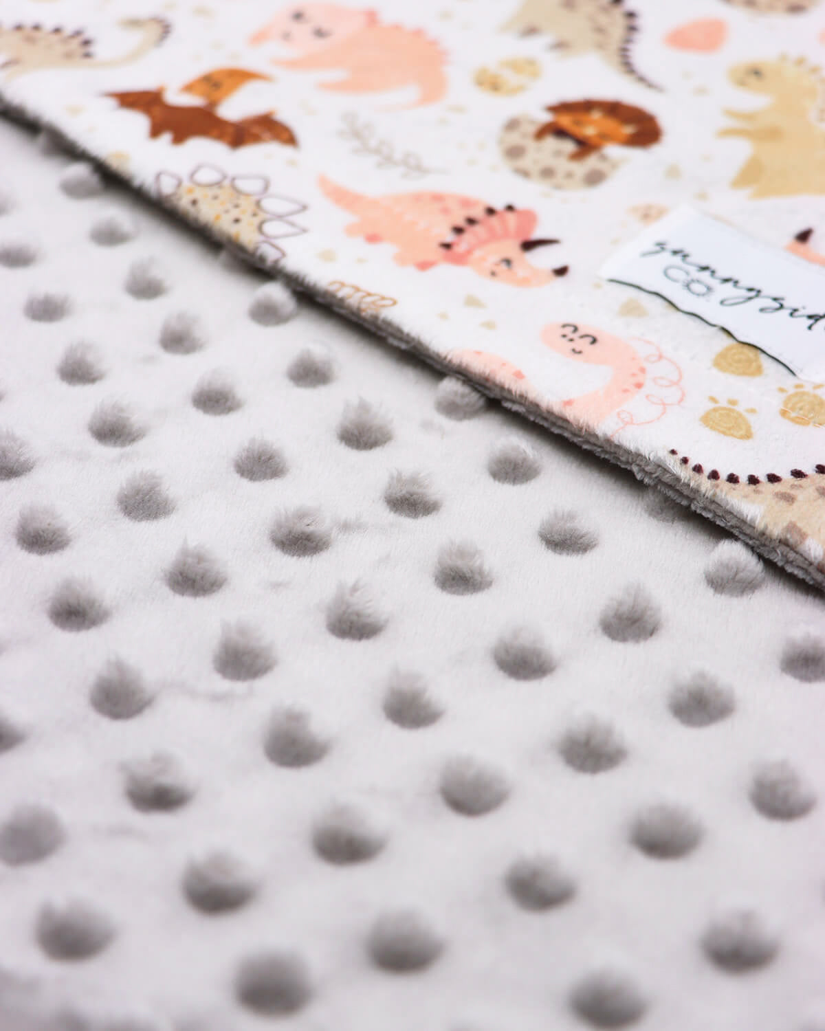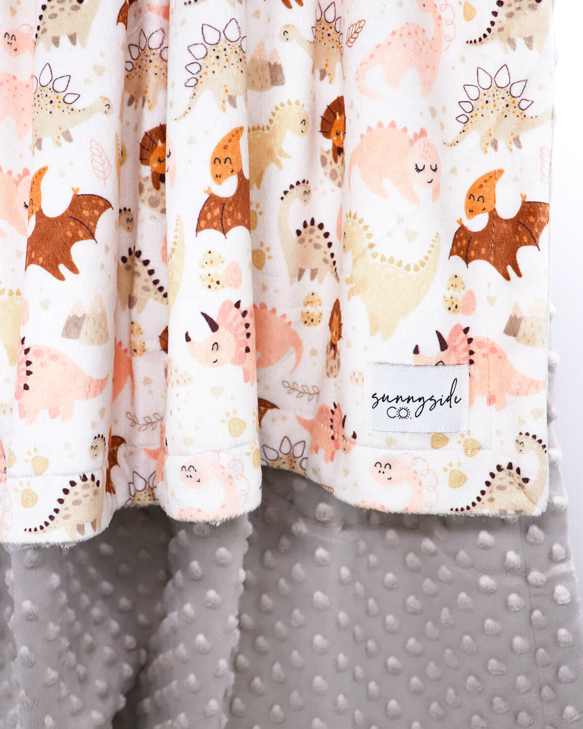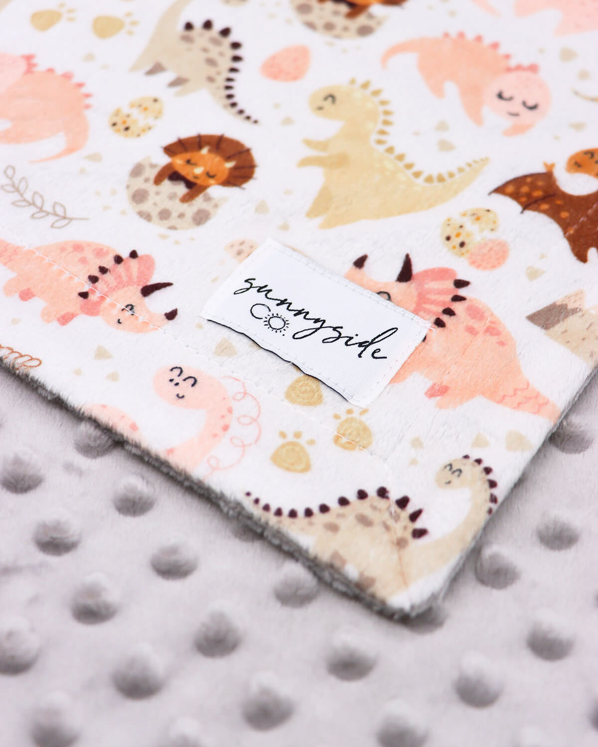 The 'Dainty Dinos' blanket features adorable dinosaur graphics in shades of pinks and neutrals. Perfect for your boho furbabies, it really is just. too. CUTE!